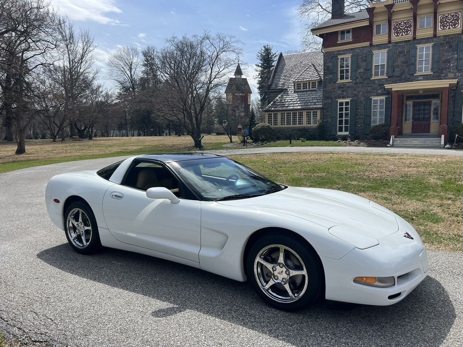 Finished in Arctic White with a Light Oak leather interior, the two-door coupe reflects the styling direction that defined the Corvette lineup during the C5 era. The exterior is complemented by polished aluminum wheels and a removable glass roof panel, giving drivers the option of open-air motoring while maintaining the structure of a fixed-roof design.
