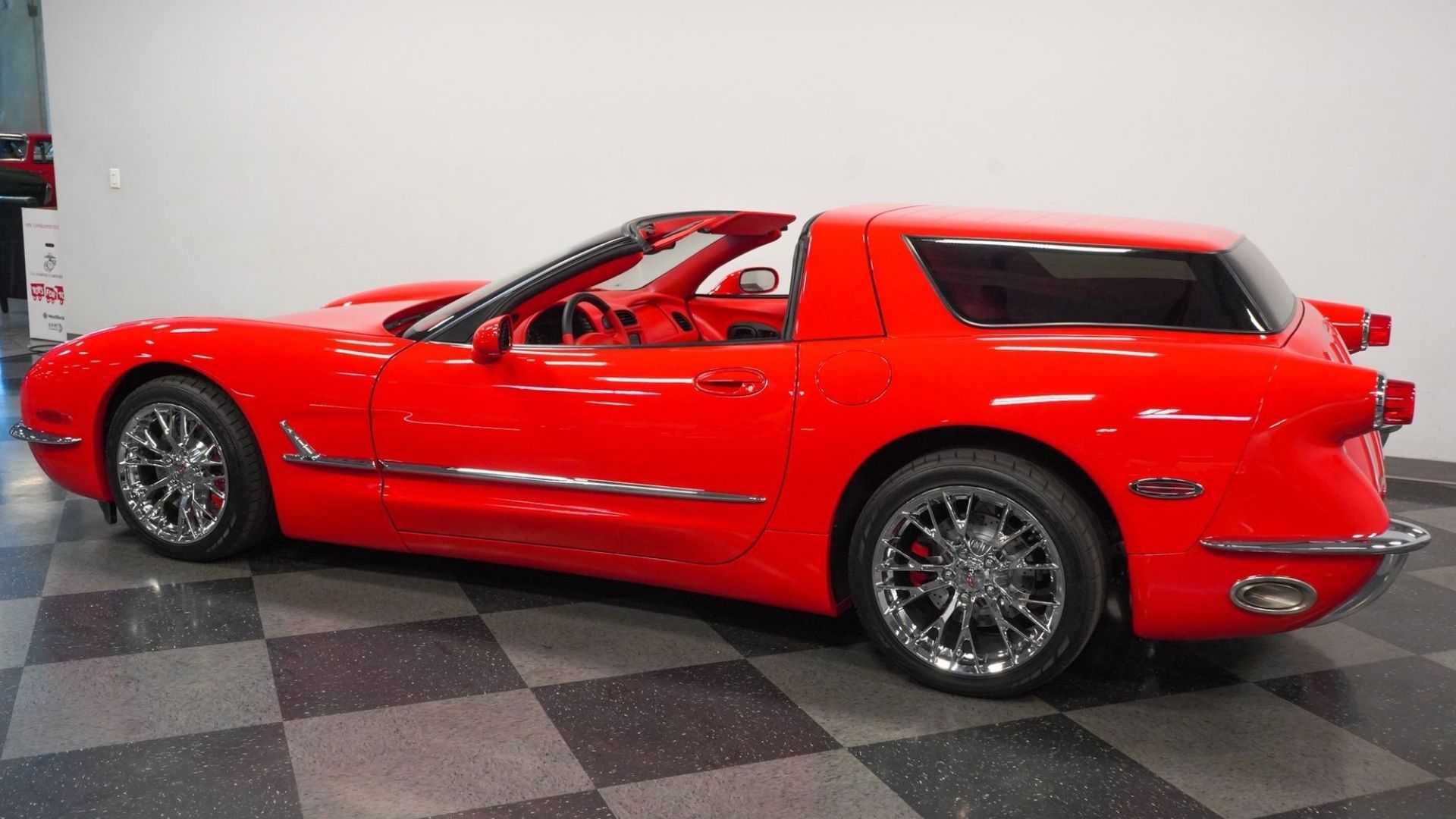 In case you don’t immediately make the connection, this car has been modified to look like the 1954 Chevrolet Corvette Nomad concept car. To achieve that effect, bodywork was custom-made for this ride, mimicking the wagon’s lines. It has that toothy grin up front, chrome light grilles, side spears, and that raised rear with rocket taillights which will blow you away. Supposedly, there were only 6 of these made and this is the only one in red, a color many people love for any ‘Vette.