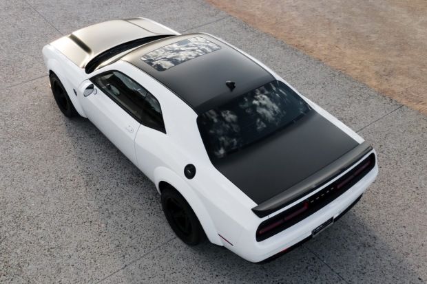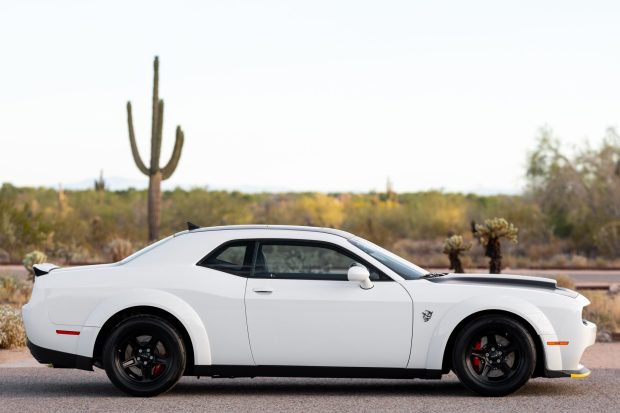 The exterior of the SRT Demon is finished in White Knuckle, complemented by painted Black Satin graphics that accentuate its aggressive stance. Noteworthy features include an Air-Grabber hood, widebody fender flares, a rear spoiler, and LED taillights, all of which contribute to its unmistakable presence on the road. Inside, the cabin showcases a blend of luxury and performance, with heated and ventilated front seats upholstered in Black Laguna leather with Alcantara inserts. Advanced amenities such as dual-zone automatic climate control and UConnect infotainment with navigation elevate the driving experience to new heights.