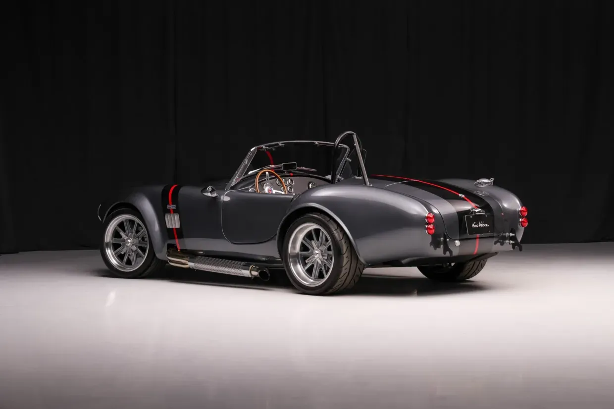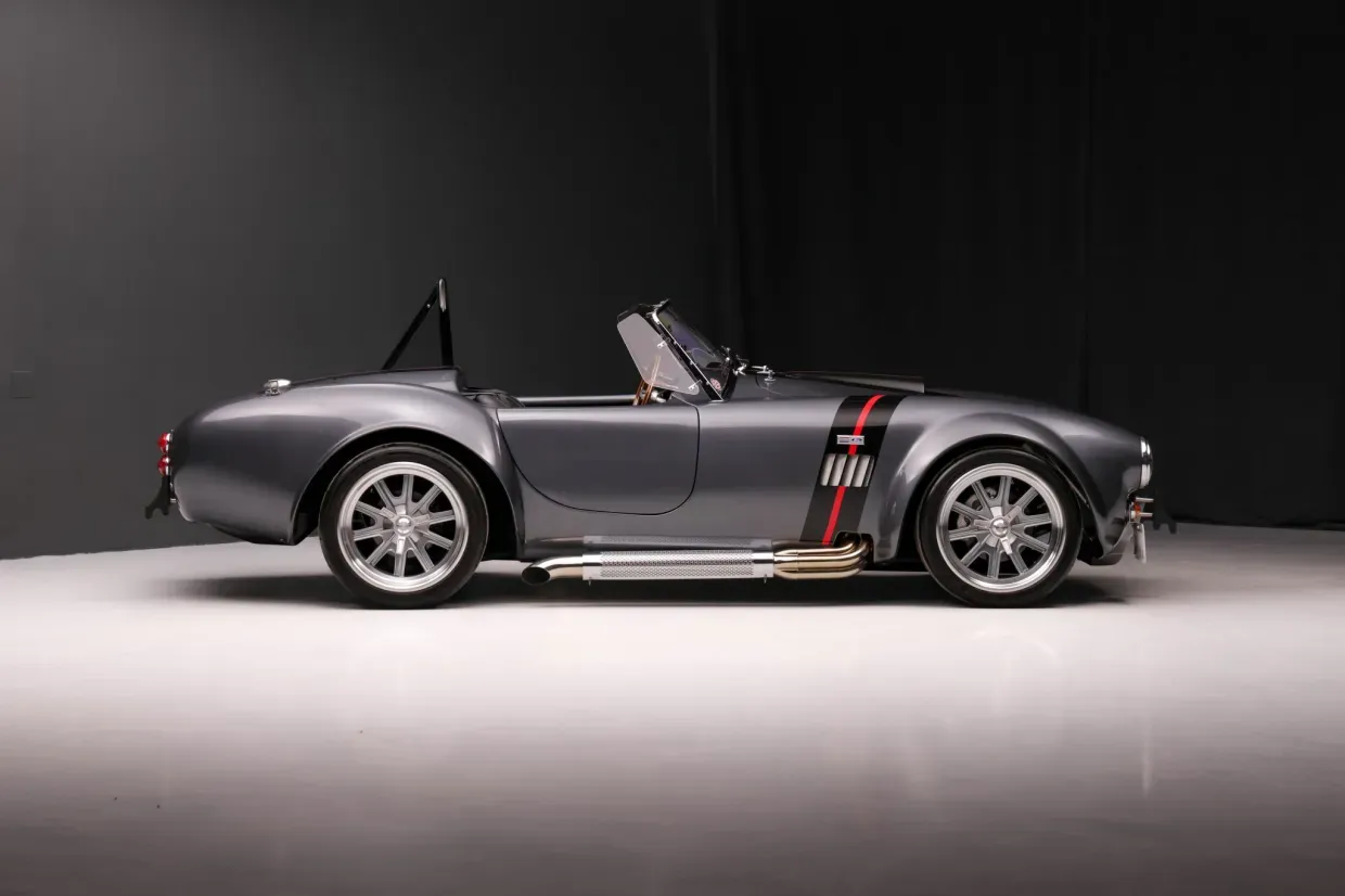 The modern-built roadster, inspired by classic Cobra styling, combines vintage design elements with contemporary performance upgrades. Originally sold in 2022, the vehicle was recently acquired by a New York-based dealer and is now being offered again, this time with additional exterior enhancements including black and red over-the-top racing stripes.