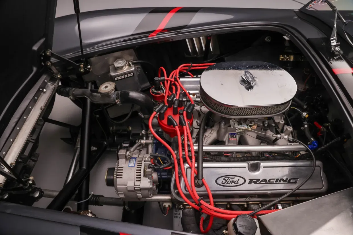 Under the hood, the vehicle is powered by a modified 351 Windsor engine that has been stroked to 408 cubic inches. The engine is equipped with forged internal components, ported and polished aluminum cylinder heads, and multi-port electronic fuel injection. Additional performance components include a high-performance camshaft, upgraded oil system, and stainless-steel headers. Power is delivered through a Tremec five-speed manual transmission to an 8.8-inch rear end with a limited-slip differential.