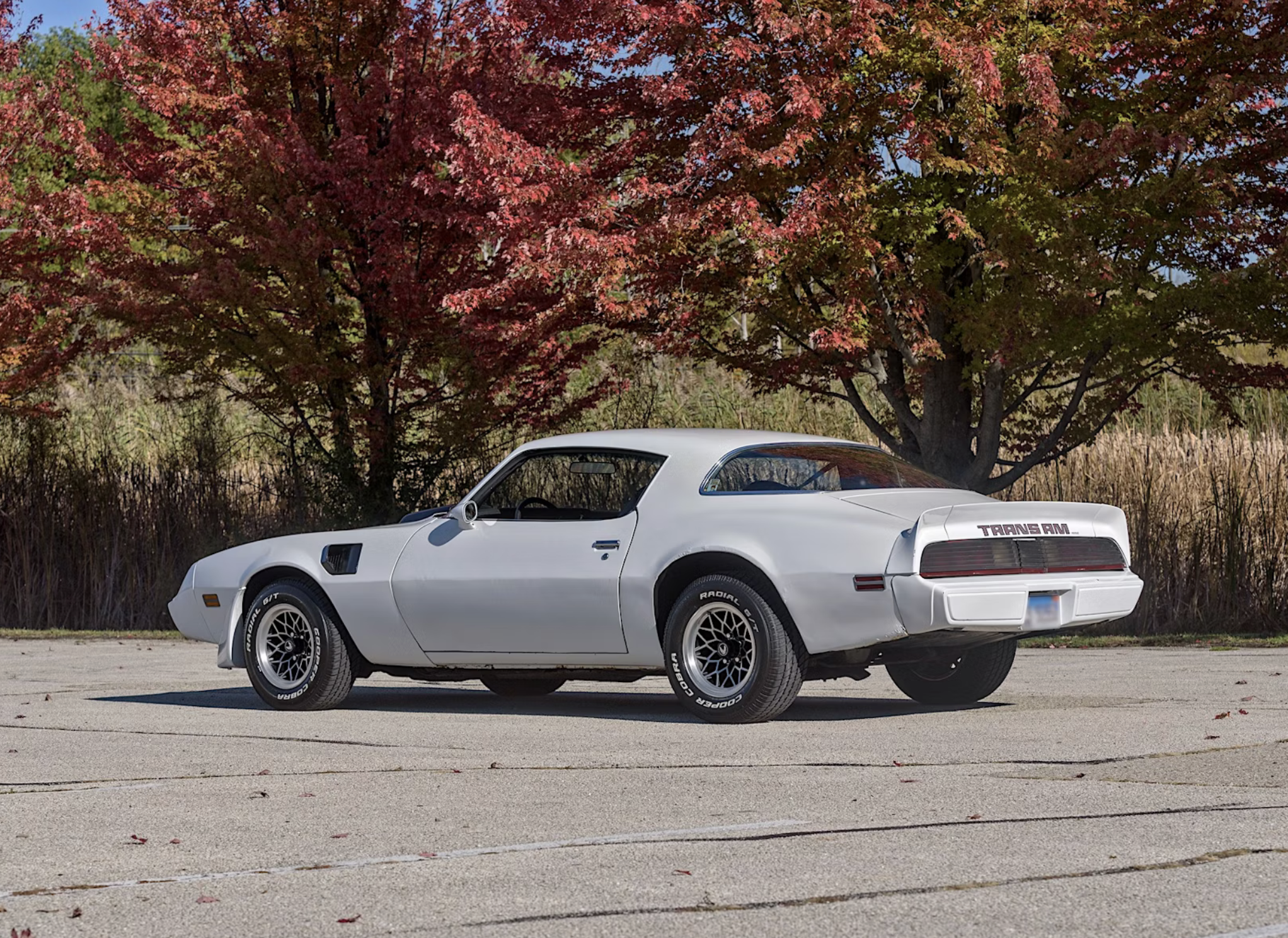 Originally finished in blue and powered by a 301-cubic-inch V8, this Trans Am began life as a California-built example. It now wears a white respray accented by black graphics, complemented by 15-inch “snowflake” wheels wrapped in Cooper Cobra Radial G/T tires. The transformation under the hood is the most significant change—a cammed 455-cubic-inch Pontiac V8 paired with a four-speed 200-4R automatic transmission. The car also features dual exhaust, Moroso valve covers, and aftermarket mufflers, giving it a more aggressive performance tone.
