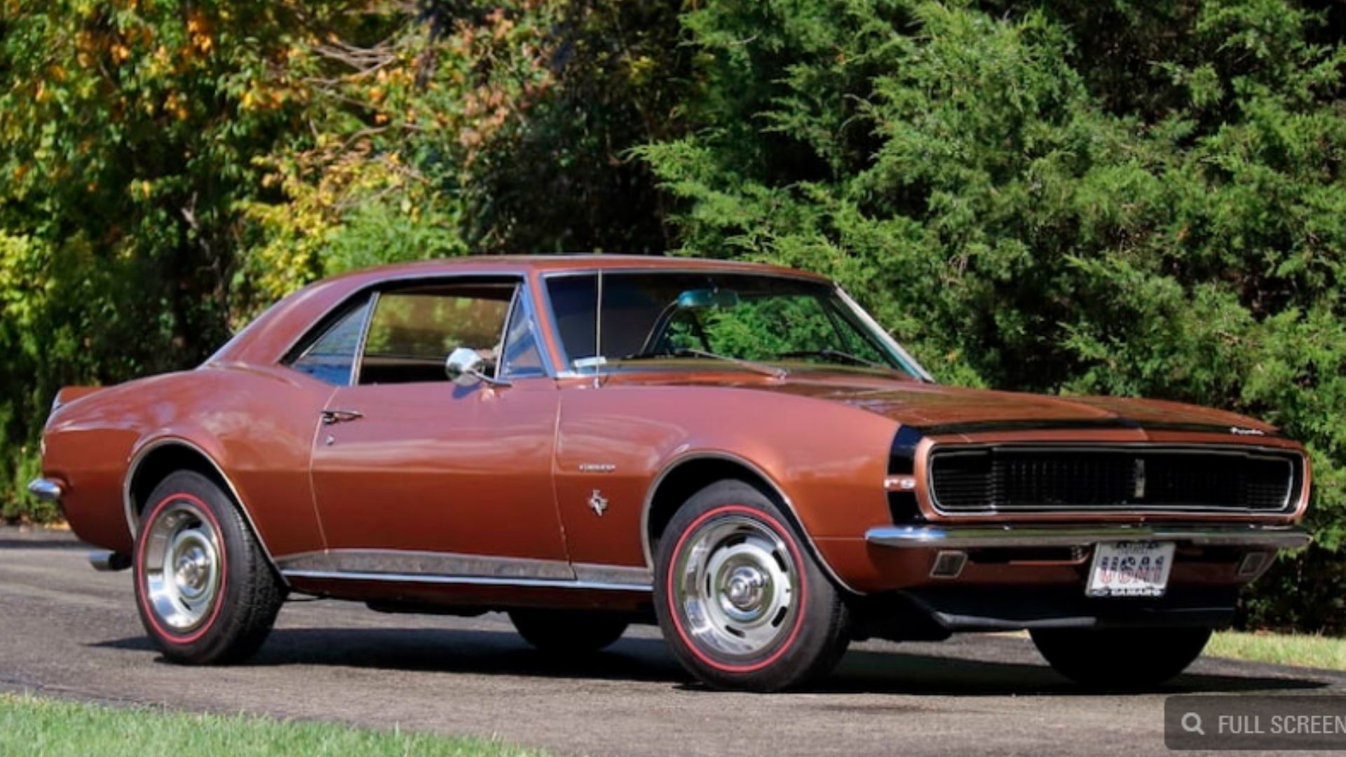 Going in chronological order, the first is a 1967 Chevrolet Camaro RS. It looks sharp with a Bronze exterior and black nose stripe, plus a gold interior. This car also comes with the 327ci V8, automatic transmission, rear spoiler, redline tires, and a modern Pioneer AM/FM/CD stereo.