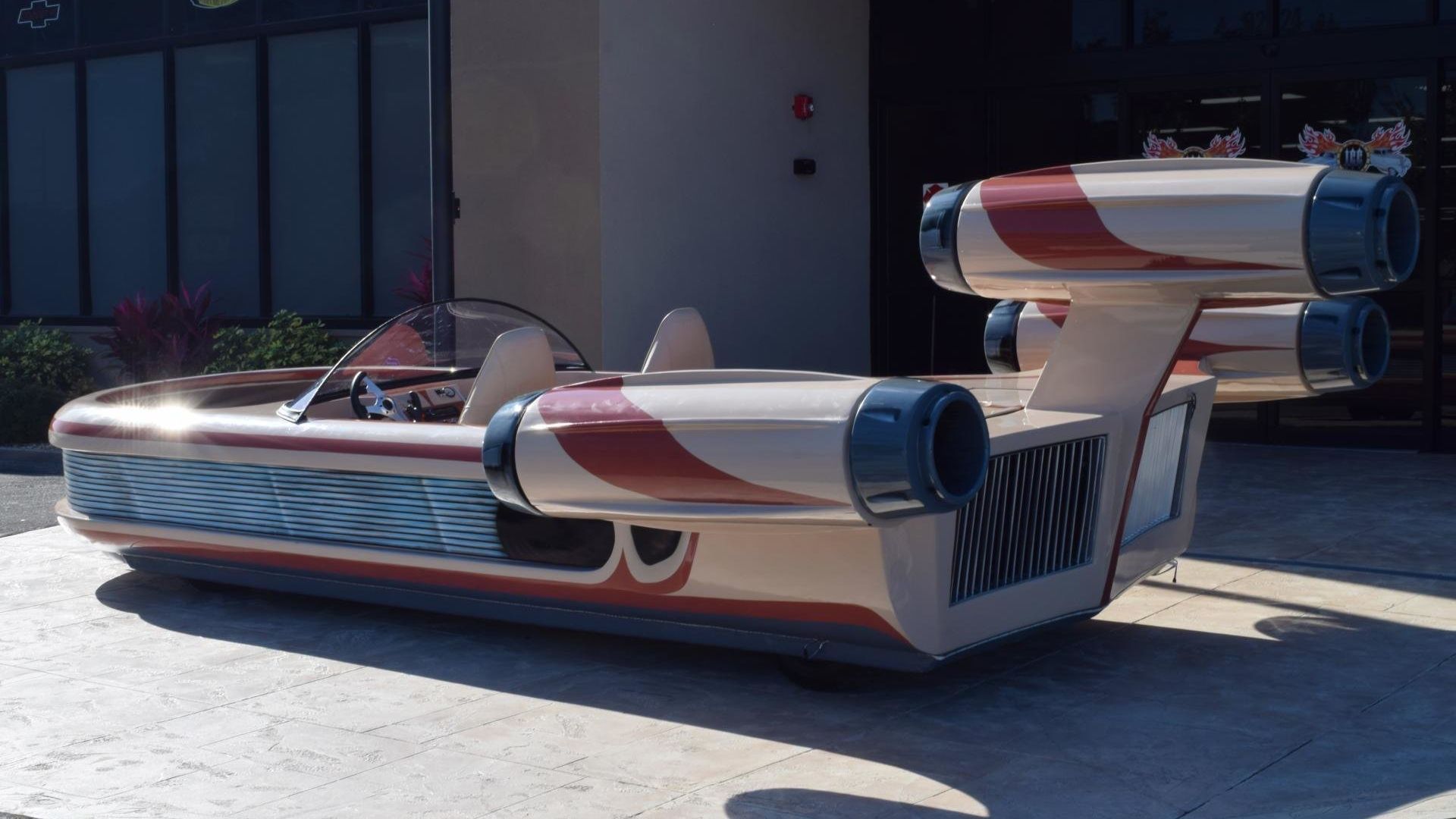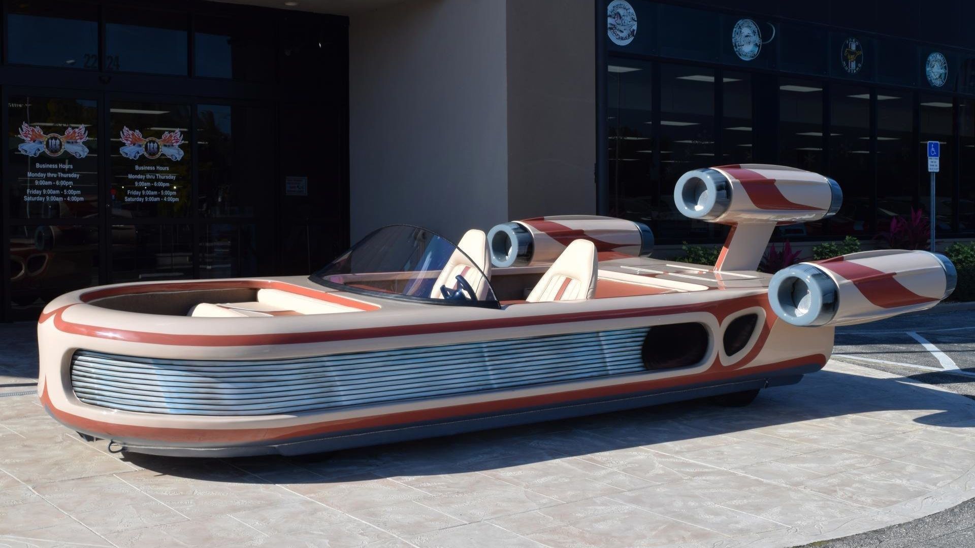 Under the skin is a custom chassis with an air ride suspension to keep this landspeeder gliding nice and smooth. There’s also a Honda motor, and while the dealer doesn’t specify the location, the rear looks to be the only spot it could be hidden away.