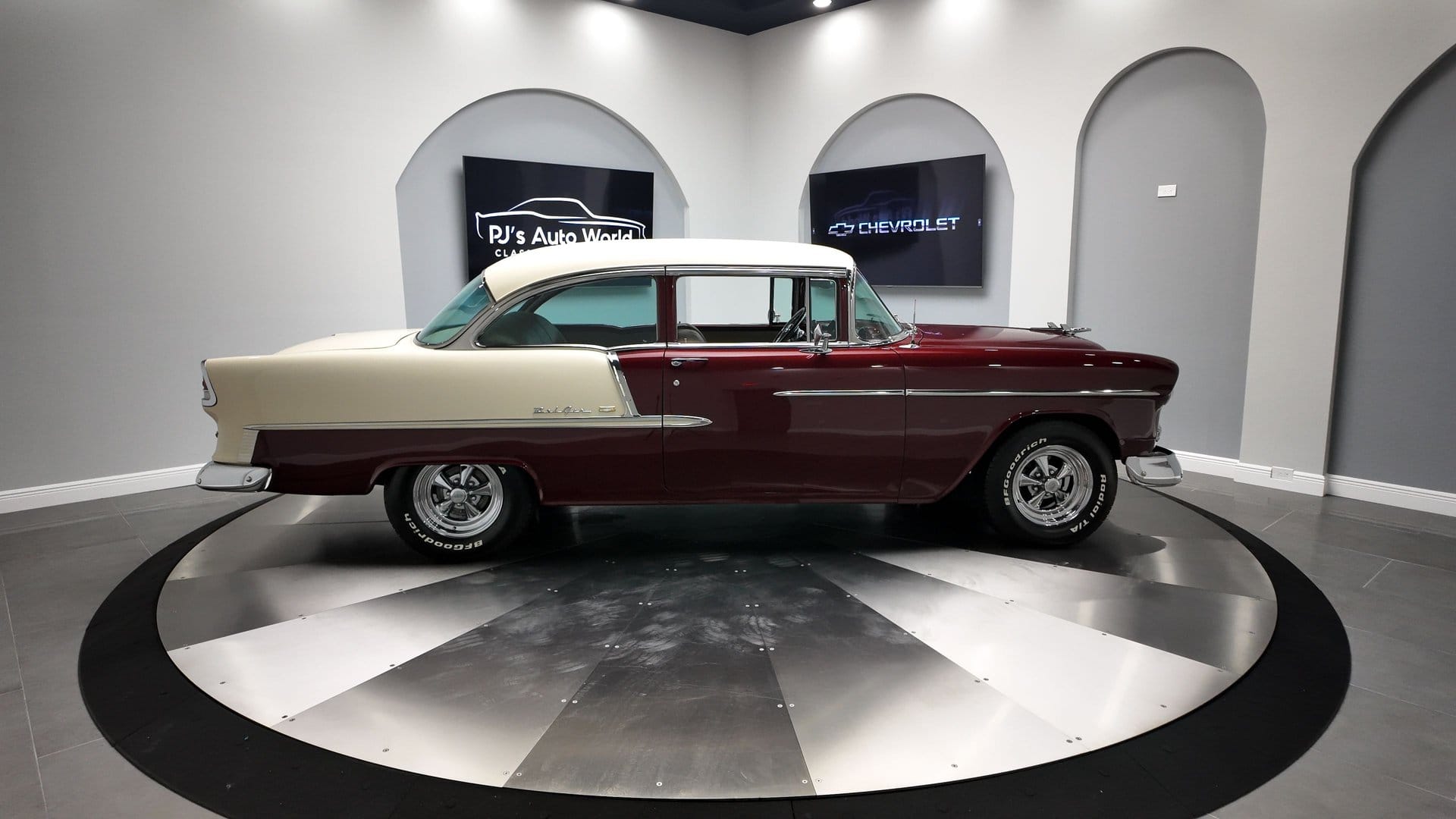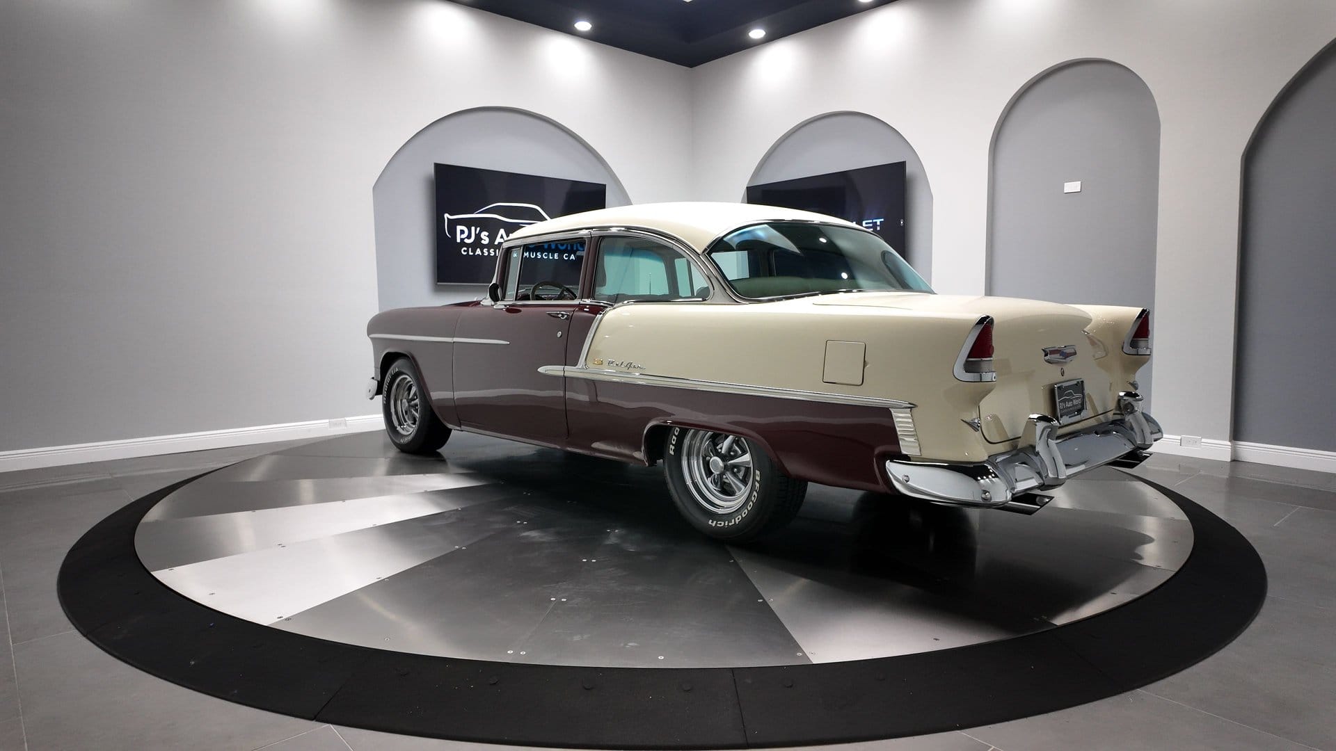 This stunning two-tone 1955 Chevy Bel Air blends vintage style with modern upgrades including A/C, power steering, and leather interior.