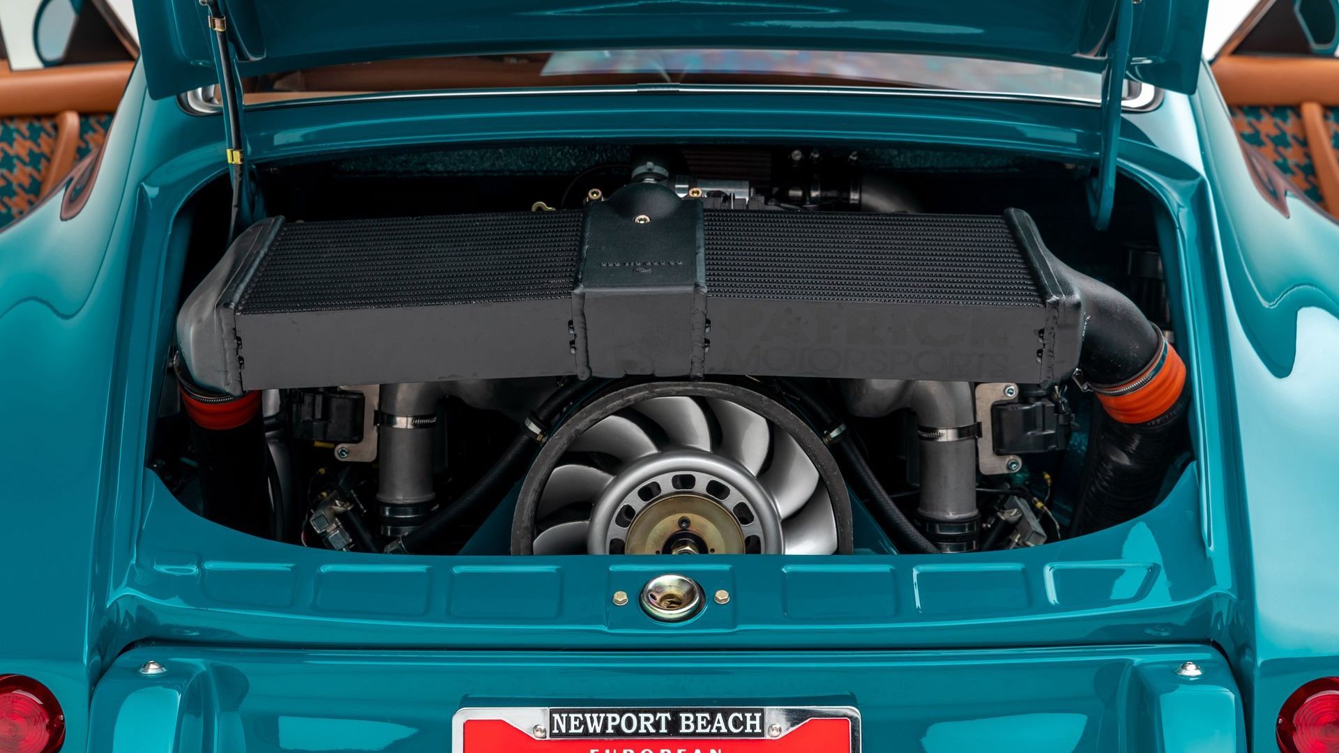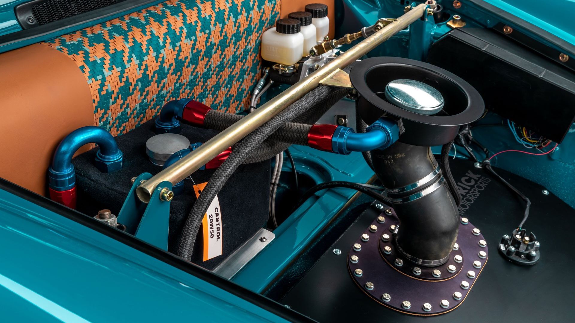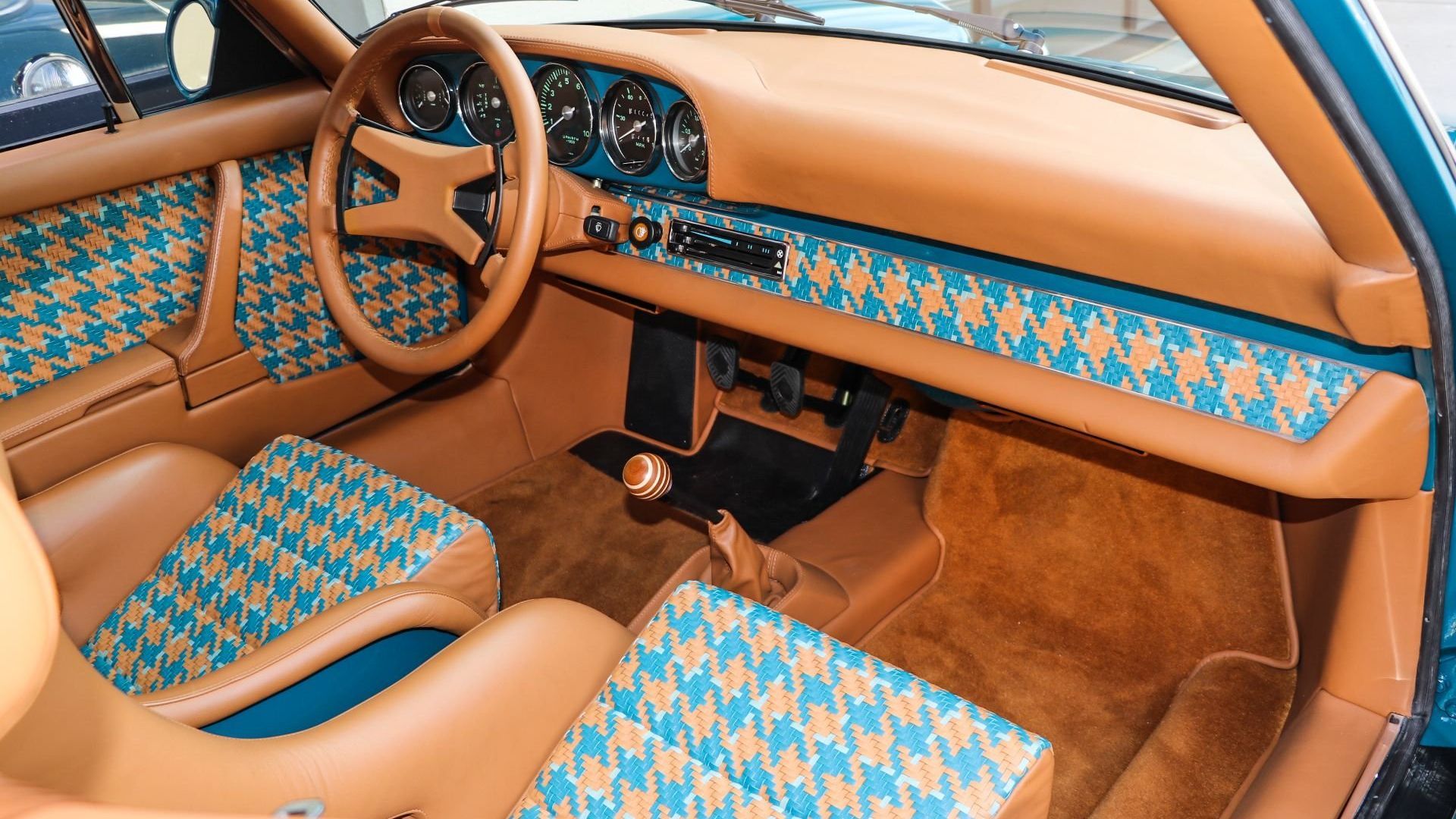 A stylish interior sports tan leather with custom houndstooth inserts for the seats, door panels, and dash. The color in those inserts matches the body, and so does the gauge cluster surround. A wood shift knob adds to the luxurious feel. Wool carpets punch up the plushness further. You’ll note the seats feature big bolsters and harnesses. There’s also a roll cage installed, with leather wrapped around it for greater comfort and improved aesthetics.