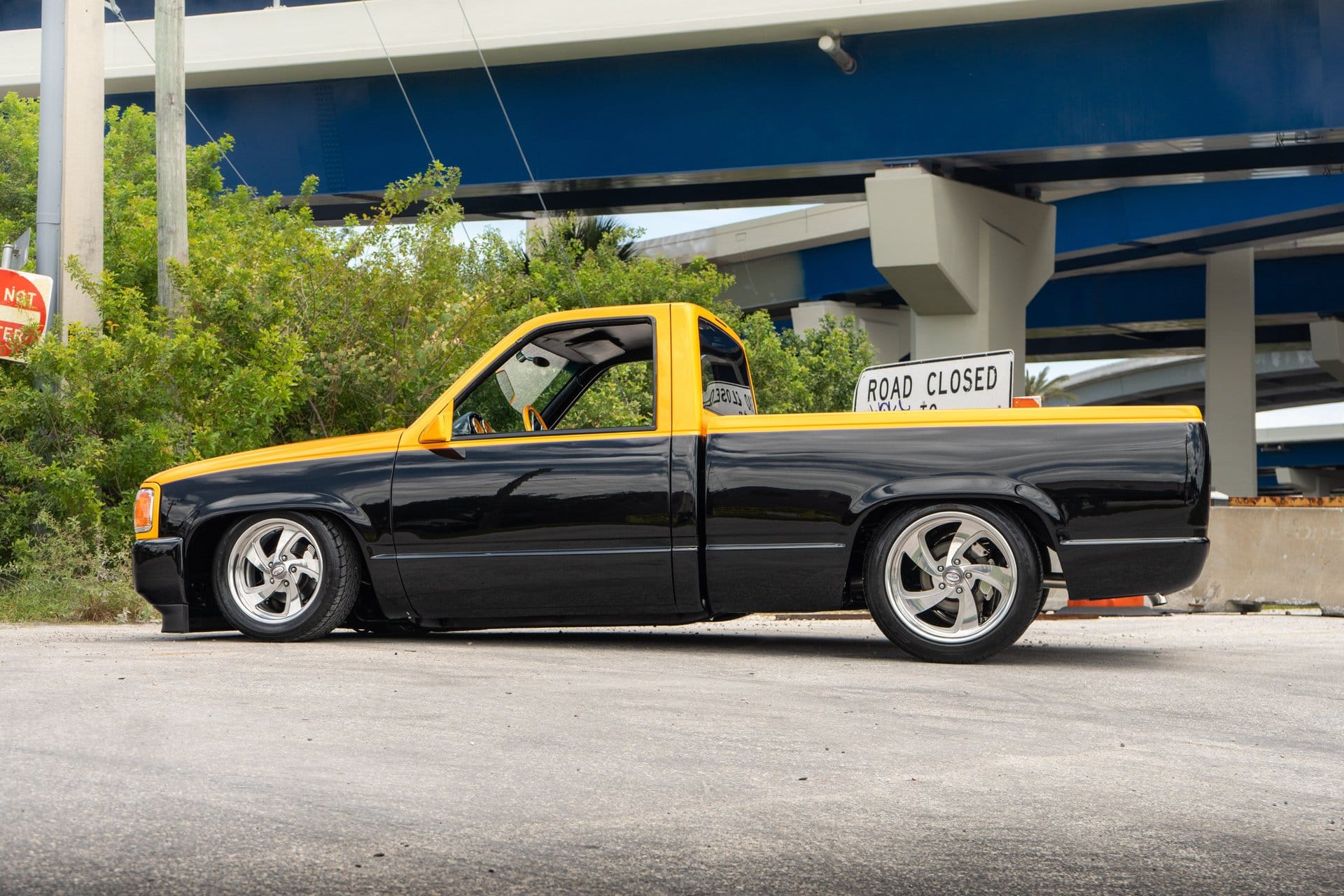 At first glance, the truck’s Escalade-style front fascia, multicolor pinstriping, and aggressive black and yellow paint scheme signal that this is no ordinary C1500. With shaved door handles, flared rear fenders, and a one-piece custom bed topped with an aluminum tonneau cover, the exterior is as bold as its name. A hand-painted Cadillac emblem and "Cadi-Klysm" script round out the distinctive visual treatment.