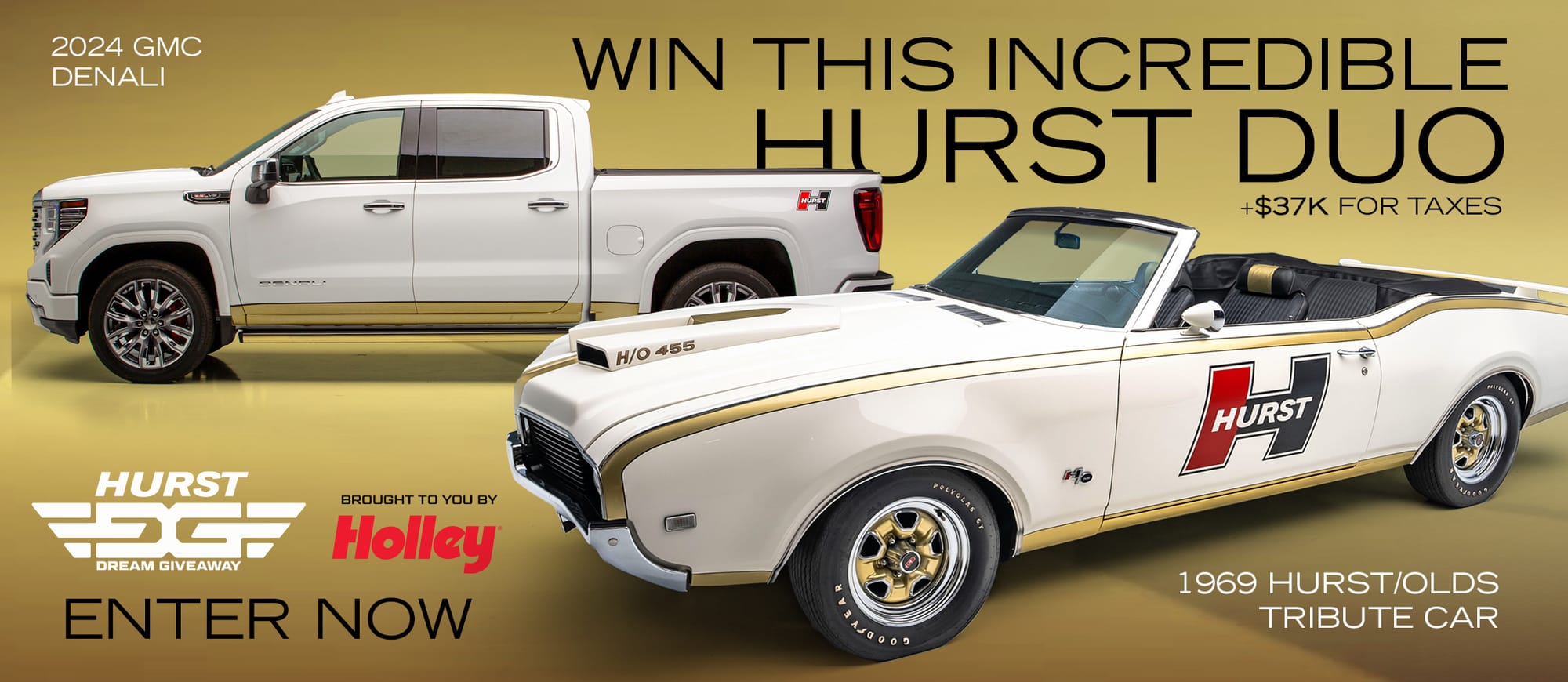 Enter the Hurst Dream Giveaway, offering a chance to win two remarkable prizes: a 1969 Hurst/Olds Convertible Tribute and a 2024 GMC Sierra Denali "Hurst Hauler."