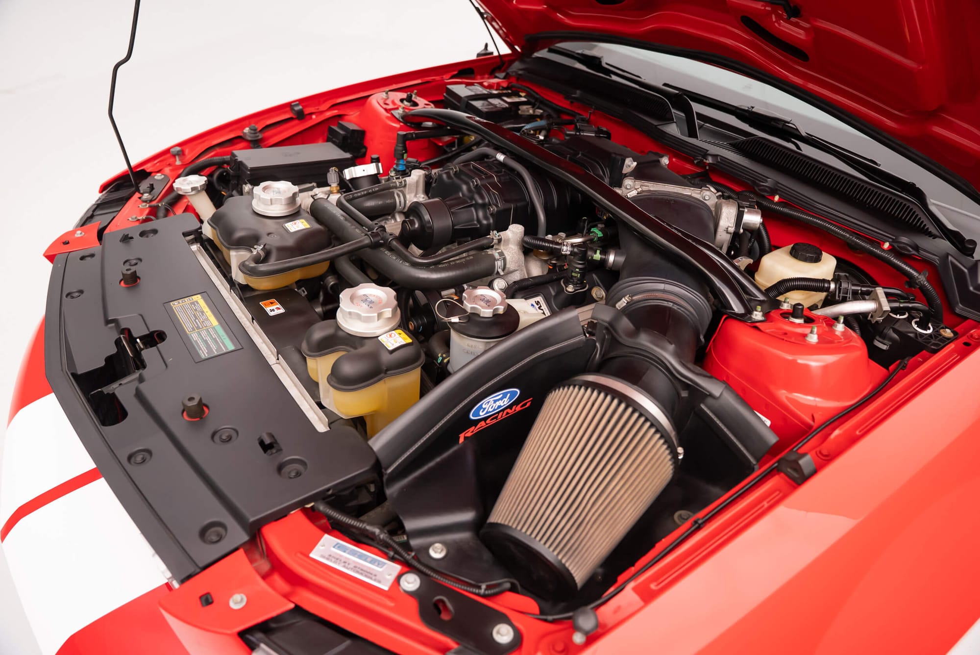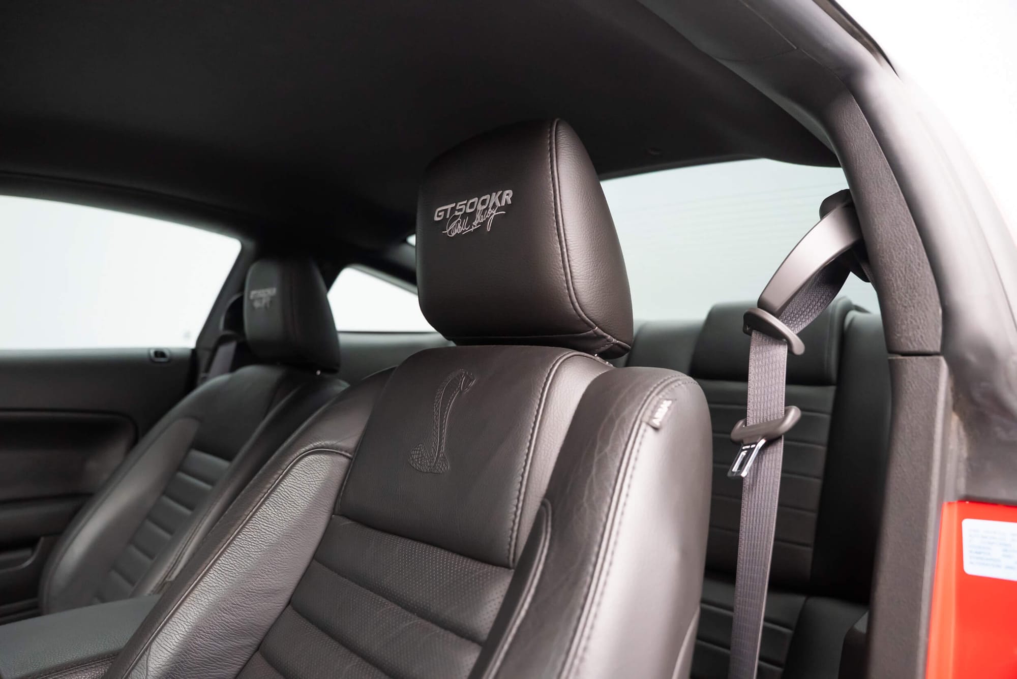 Every GT500KR left the factory with a package of performance and cosmetic upgrades that set it apart. Those include a unique Ford Racing calibration paired with a cold-air induction system, a short-throw shifter, and a 3.73 rear axle. Exterior details include a carbon-fiber hood with functional vents and traditional hood pins, while the interior and exterior both feature exclusive KR-specific touches.