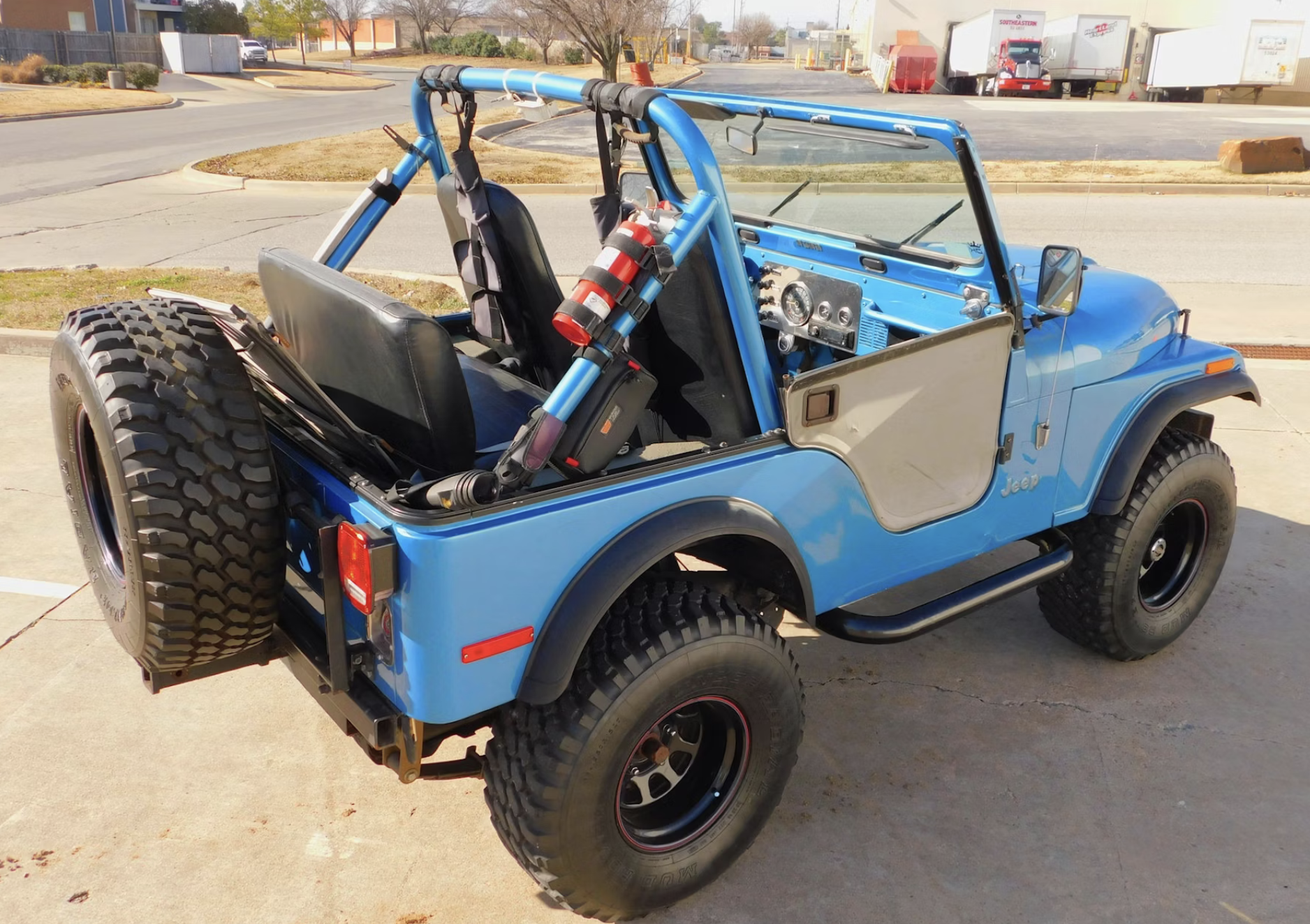 Exterior additions include fender flare trim, nerf bars, a grille cover, fabric soft doors, and a Valley swing-out rear spare tire carrier. The Jeep is also equipped with a hoop roll bar and a 90-mph speedometer. Included with the sale are a swing-away rear-mounted spare tire, an axe, and a fire extinguisher.