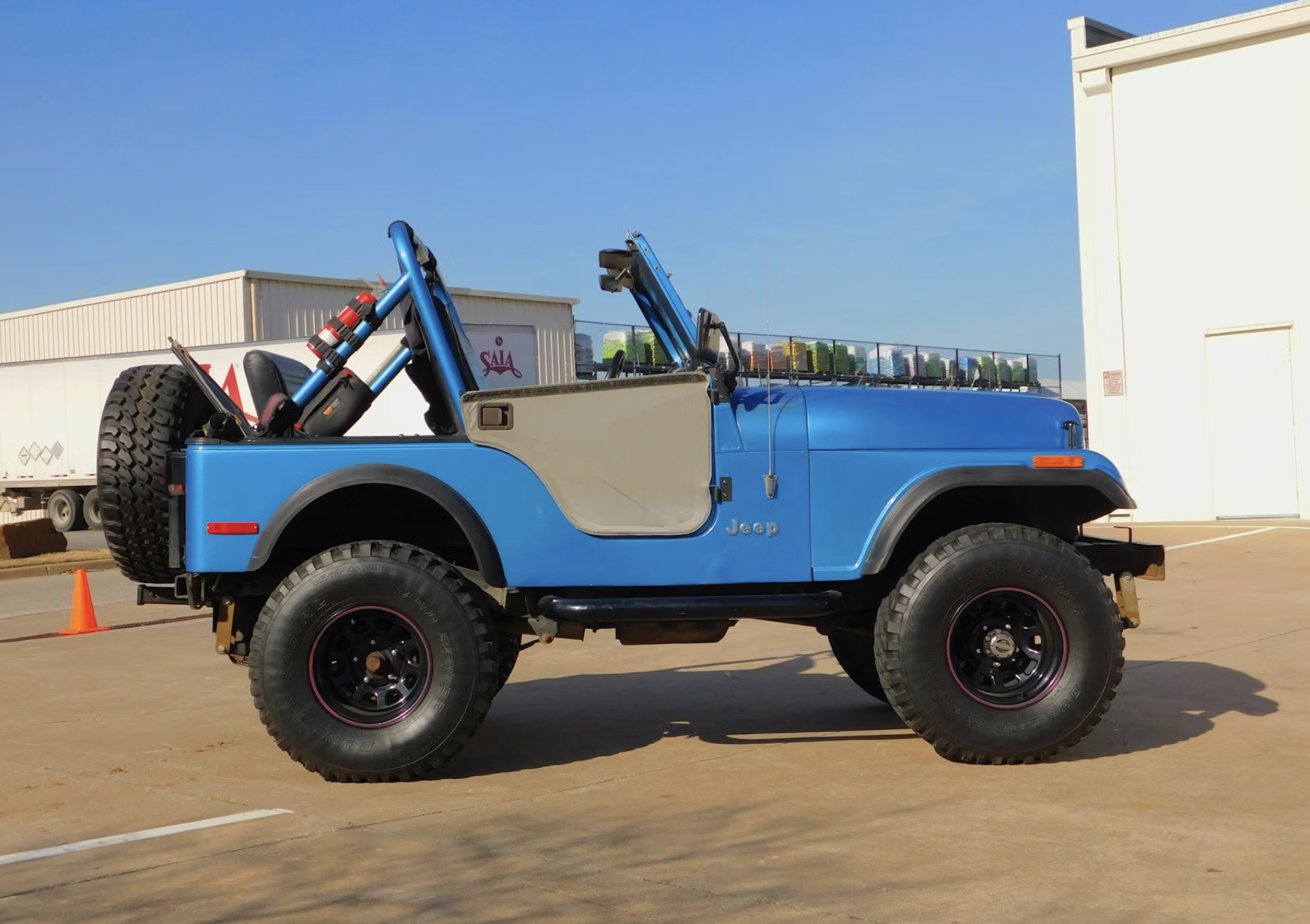 This example has been refinished in blue over a black vinyl interior and shows 61,600 miles indicated, listed as true mileage unknown. It features a number of upgrades, including power steering, a suspension lift to accommodate 33-inch Dunlop Mud Rover tires, Warn locking hubs, and custom wheels. Additional modifications include Leon Rosser bucket seats, a sport steering wheel, a Boss AM/FM/CD stereo with Bluetooth and AUX capability, an AutoGage 8,000-rpm tachometer, and a center console with cup holders.