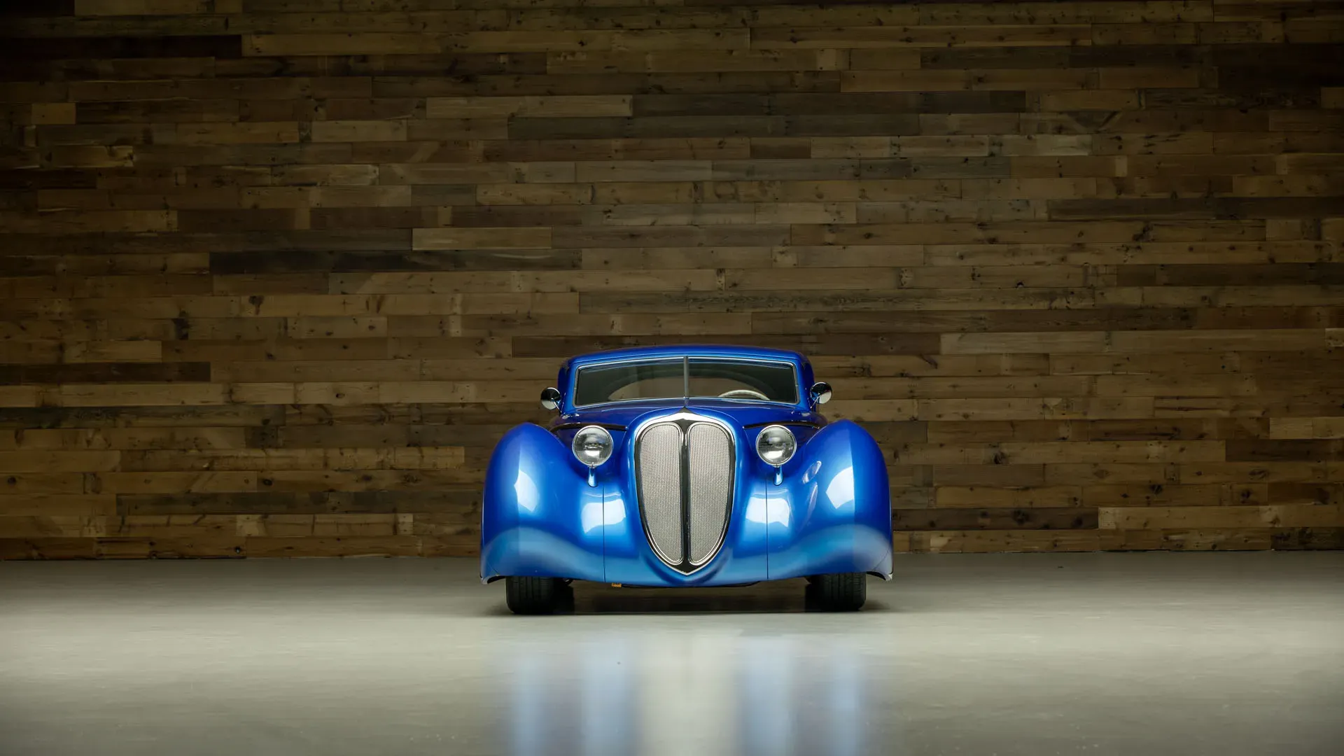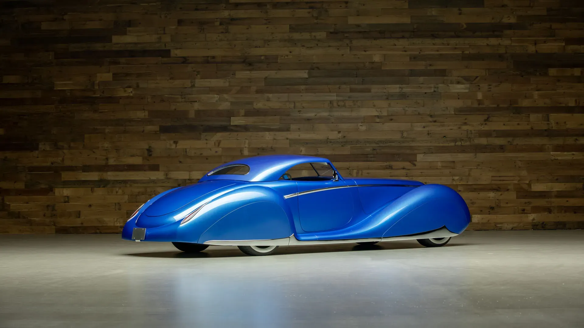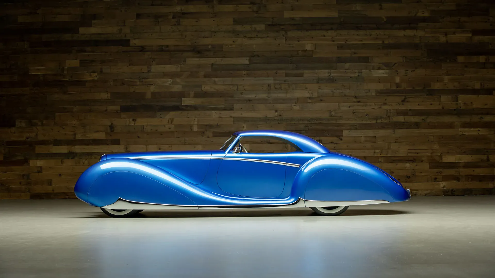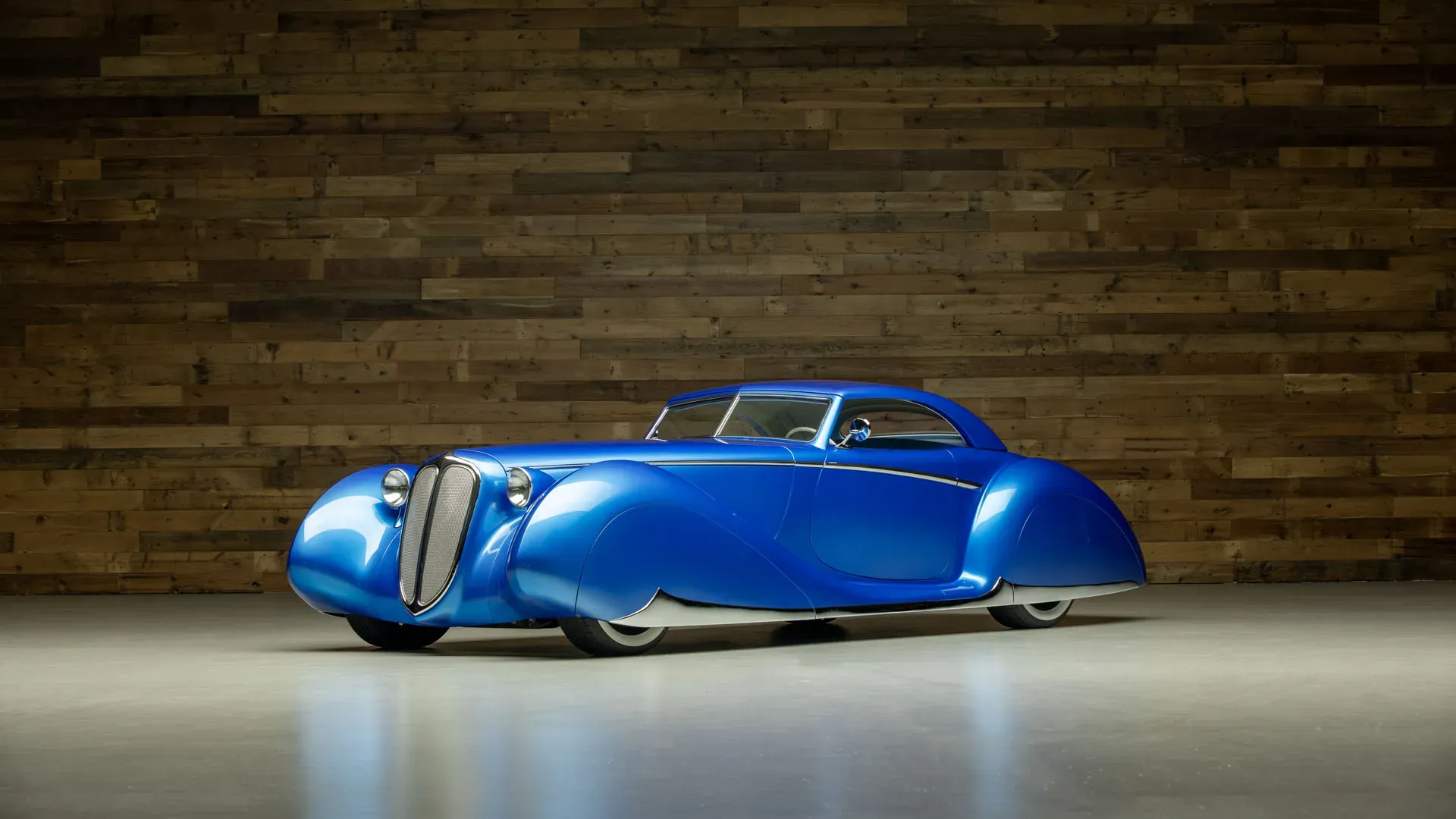 Built on an Art Morrison chassis, the Pantheon features a fully hand-formed aluminum body created through an intensive process that highlights traditional metalworking techniques. The design incorporates sculpted elements reminiscent of classic Delahaye styling, paired with modern execution. Key exterior components, including the grille and taillights, were individually formed, contributing to the car’s cohesive and dramatic appearance. The finish, presented in a deep Tahitian Blue, accentuates the vehicle’s sweeping lines and intricate detailing.