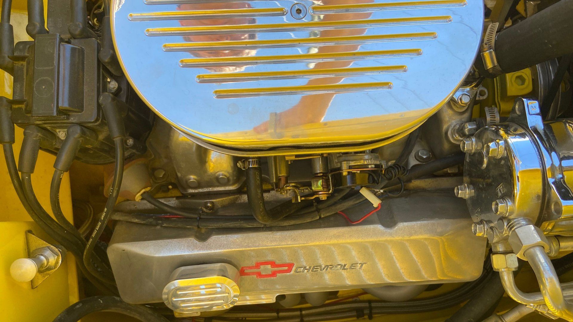 Hidden under that vented cowling is a Chevy 383ci small block V8 stroker. That means a lightweight little car has a potent engine, which is exactly how you want this thing set up. For good measure, there’s a performance carb, aluminum intake, Hooker tube headers, HEI distributor, performance plug wires, open element air cleaner with some nice chrome, etc. So you can show off your pride, the billet aluminum valve covers feature the Chevrolet logo.