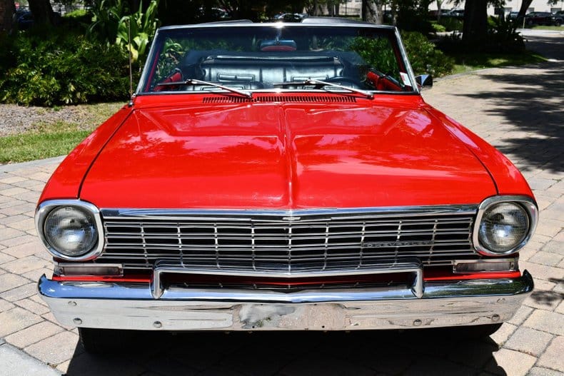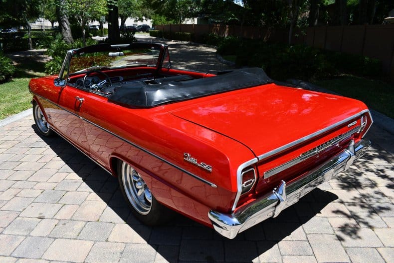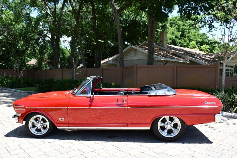 The exterior is finished in a striking red with a black convertible top, complemented by American Racing Torque Thrust wheels for a timeless look. Inside, the Nova is equipped with an Auto Meter tachometer, auxiliary gauges, a Hurst shifter, and a CD radio, blending functionality with retro flair.