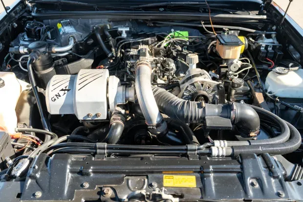 Under the hood, the 3.8-liter turbocharged V6 retains the ASC/McLaren enhancements that distinguished the GNX from the Grand National. These include a Garrett T3 turbocharger under a GNX-branded heat shield, a larger air-to-air intercooler and a freer-flowing exhaust system. The engine was factory-rated at 276 horsepower and 360 pound-feet of torque. Recent service includes a replacement mass airflow sensor and spark plugs in 2021, followed by a new fuel tank, pump and injectors in 2022.
