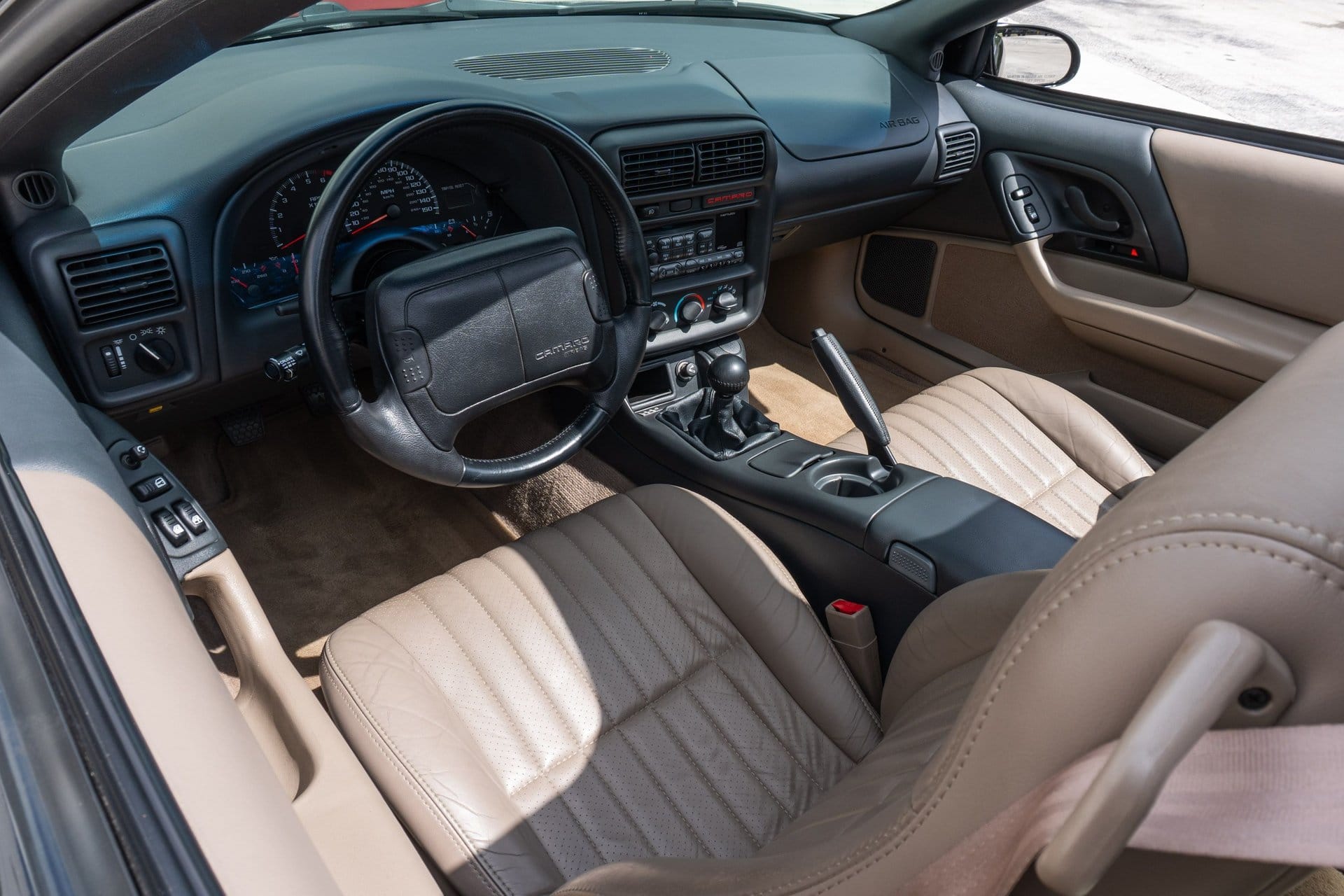 Finished in black with red striping along the hood and trunk lid, the Camaro carries the familiar SS cues, including a functional hood scoop, fog lights, and SS badging. Inside, the cabin is trimmed in Neutral leather with bucket seats front and rear. Equipment includes a power-adjustable driver’s seat, Monsoon audio system, Delco CD stereo, cruise control, keyless entry, air conditioning and power accessories.
