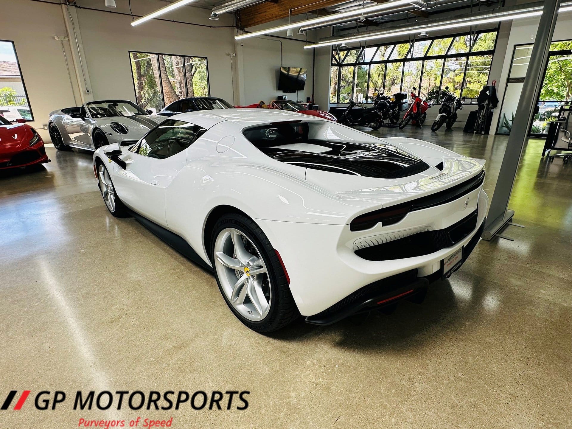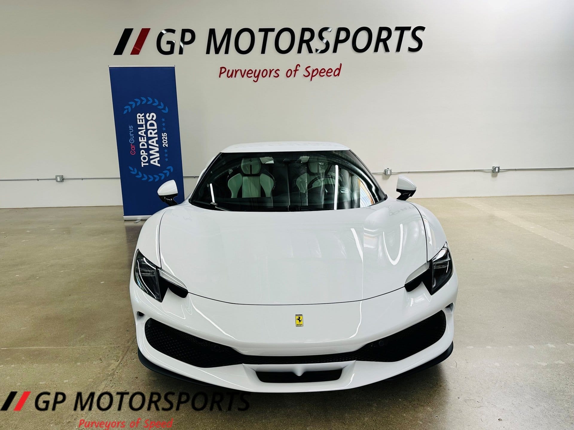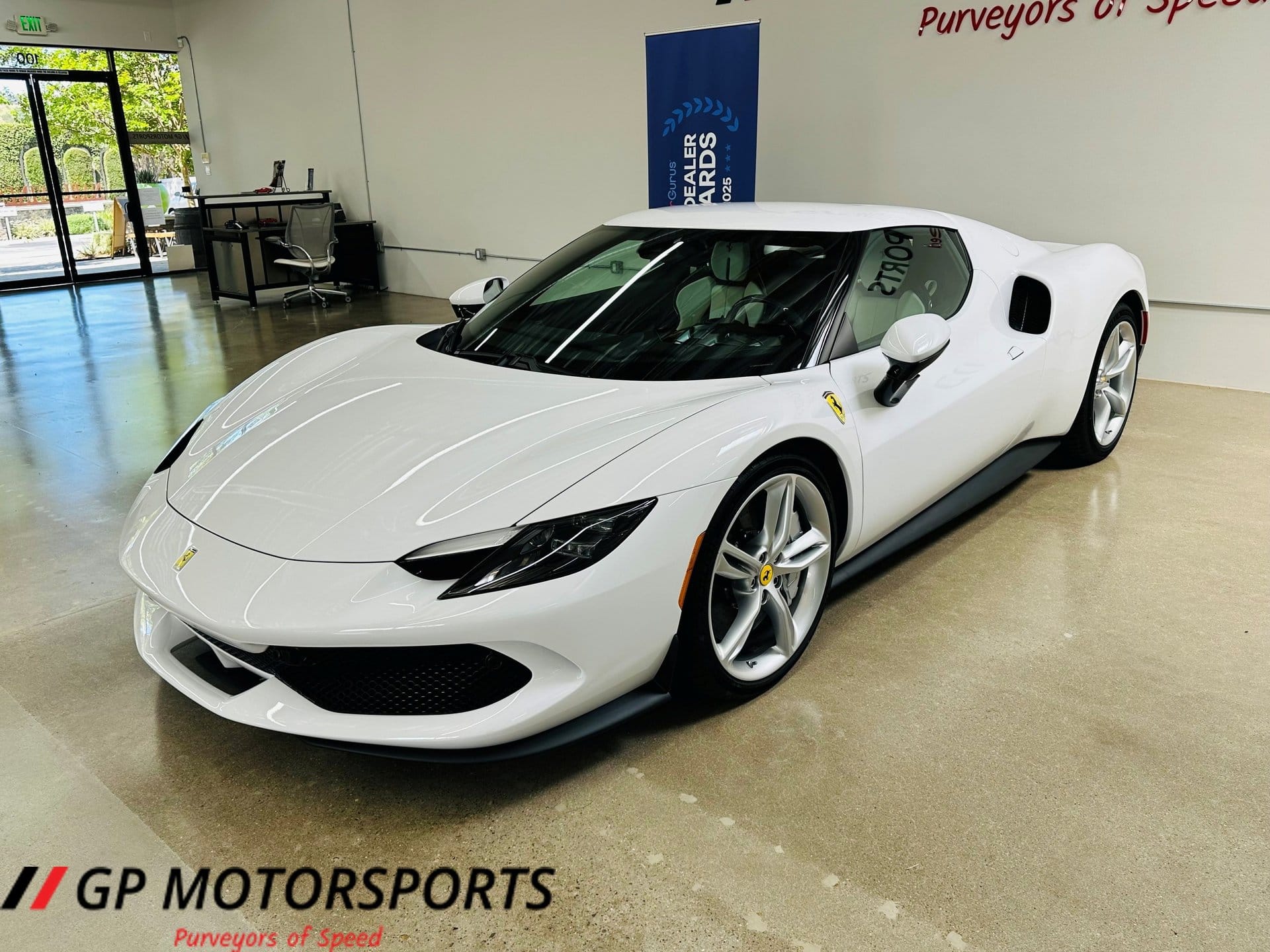 Finished in Bianco Cervino and paired with a white leather interior, the vehicle presents in near-new condition with fewer than 150 miles recorded. The low mileage highlights its limited use and positions it as a highly preserved example of Ferrari’s current mid-engine lineup.