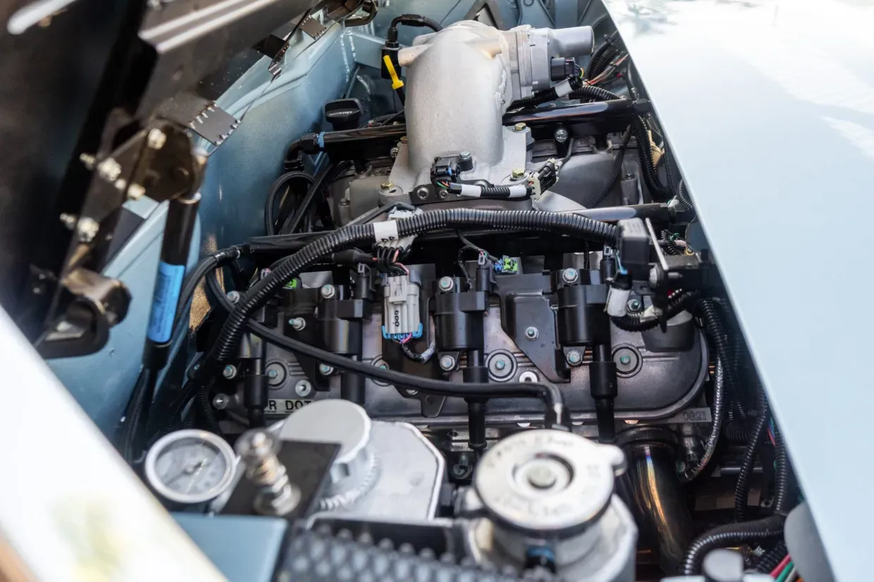 Installed in 2024, the 6.2-liter LS3 V8 features a Holley Hi-Ram EFI intake, stainless-steel headers, and Renegade Hybrids mounting hardware. Cooling is managed by a front-mounted radiator with dual electric fans. The trunk houses the engine’s wiring, control unit, and an Alpine amplifier, while welded structural reinforcements tie into the shock towers to increase chassis rigidity.