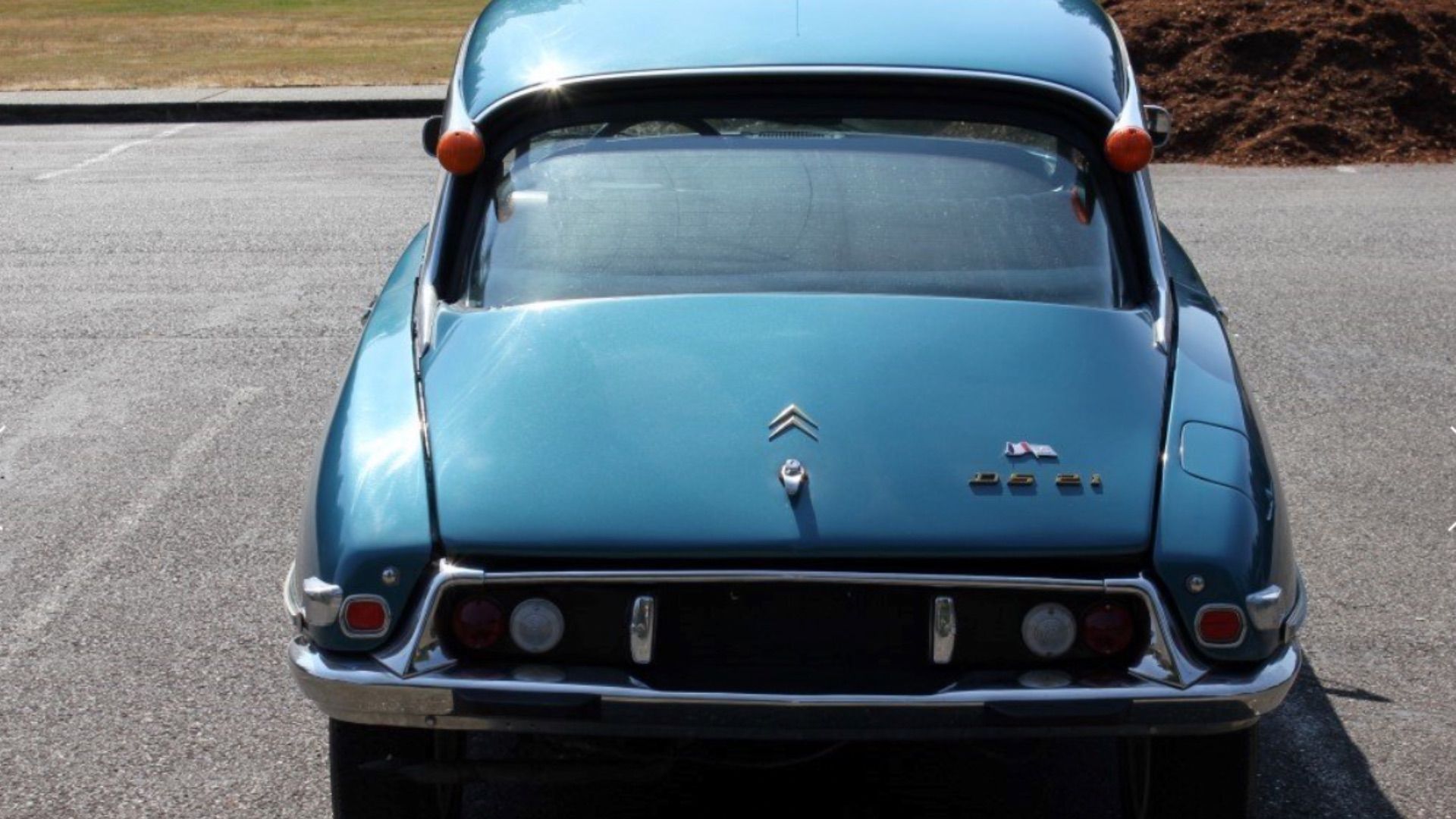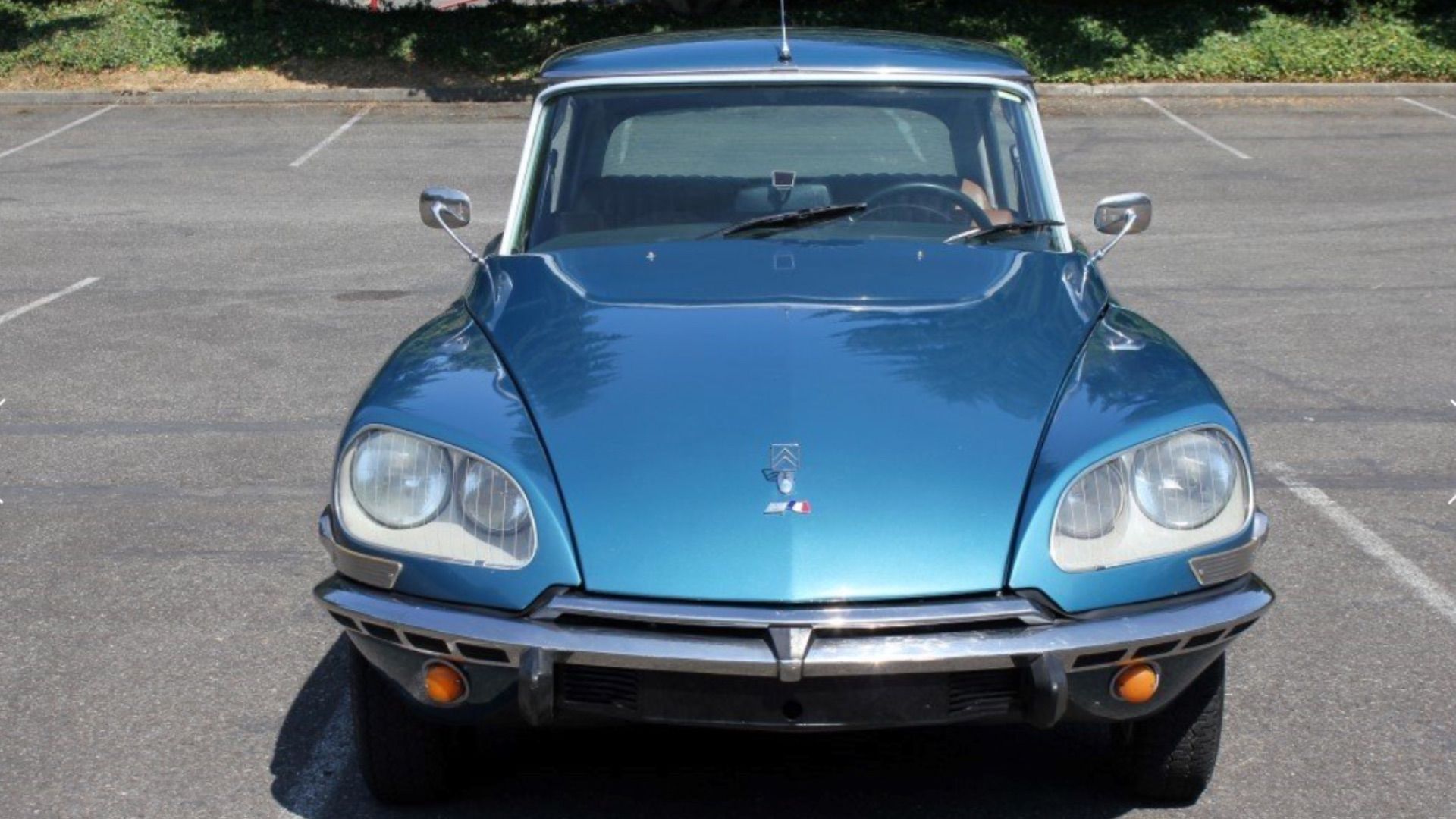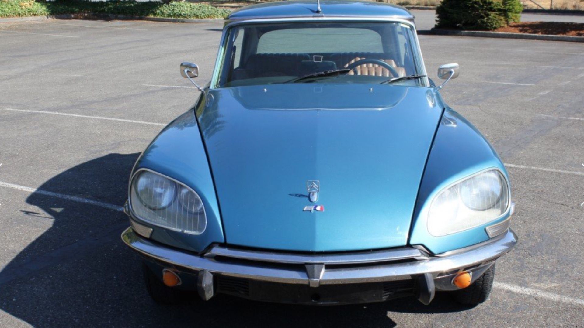 Finished in a captivating blue hue, this Citroën DS21 showcases a body that has been skillfully repainted under prior ownership. European-specification swiveling headlights with glass covers add a touch of sophistication to its front fascia, while US-specification taillights and turn signals provide a distinct appearance at the rear. The Citroën-logo hood ornament, Pallas-style side trim, and stainless-steel bumpers with black rubber guards further enhance its visual appeal.