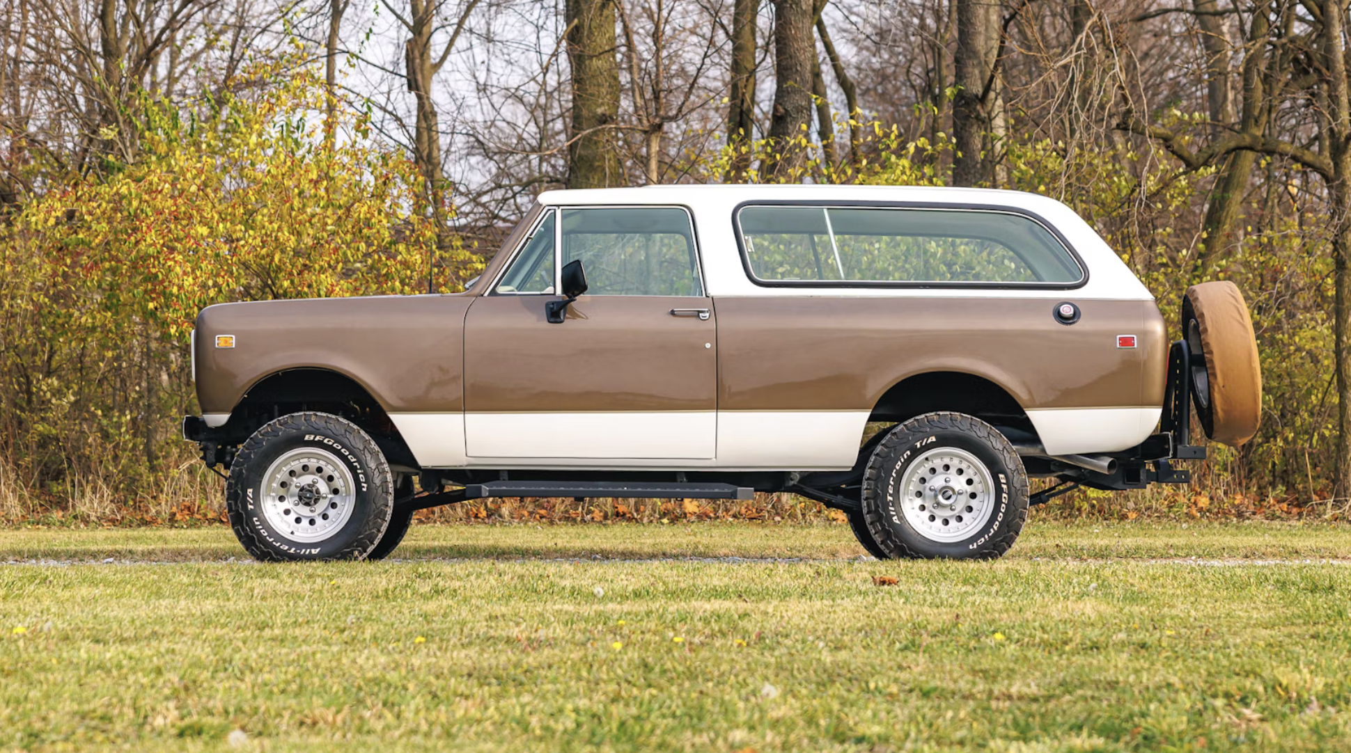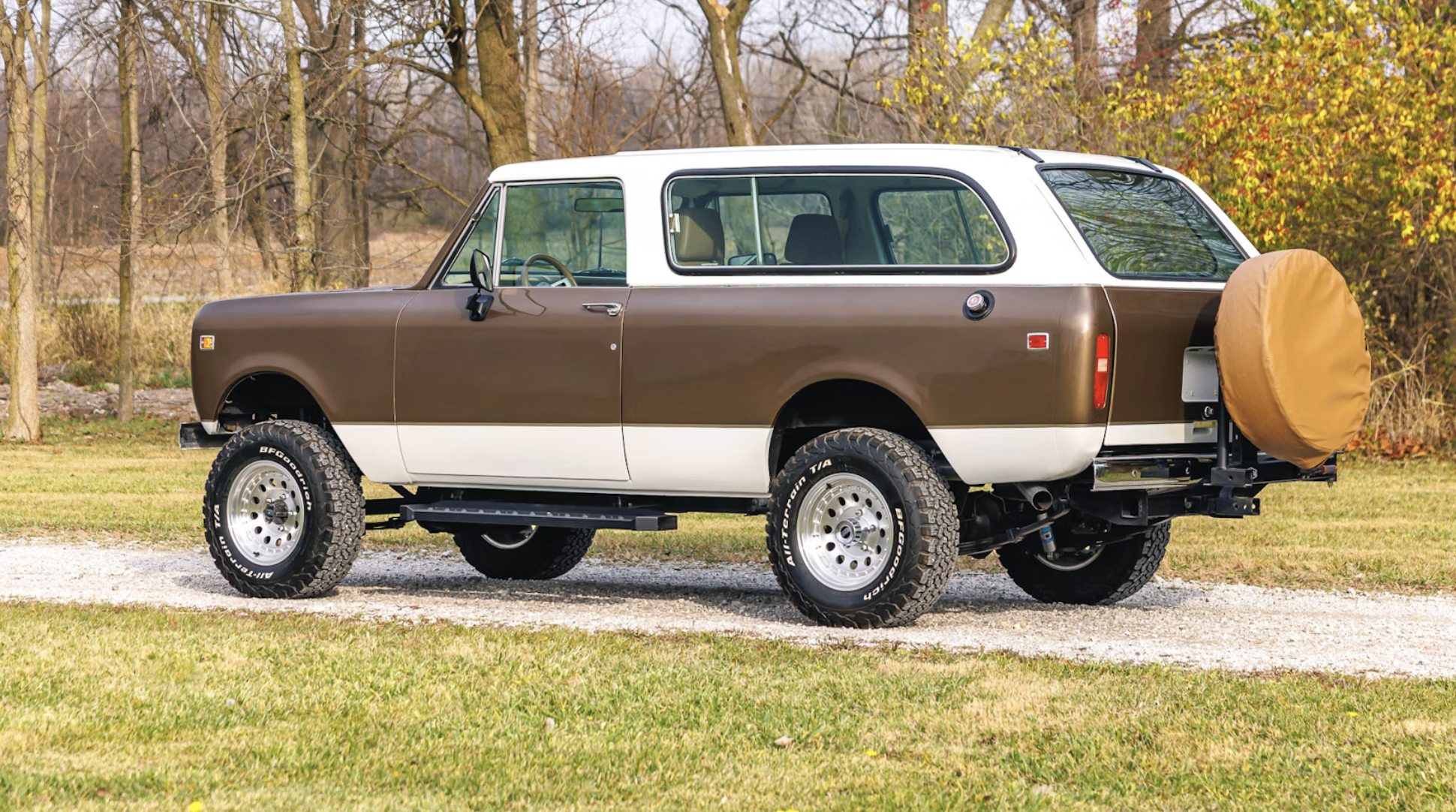 The fiberglass body, including its integral extended roof, was refinished in a tri-tone paint scheme: Gray Brown with a Gold Dust midcoat, contrasted by Diamond Ice white and a Gold Mist Metallic stripe. Additional upgrades include Bilstein shocks, stainless headers, Flowmaster mufflers, and BFGoodrich All-Terrain tires mounted on 16-inch American Racing wheels.
