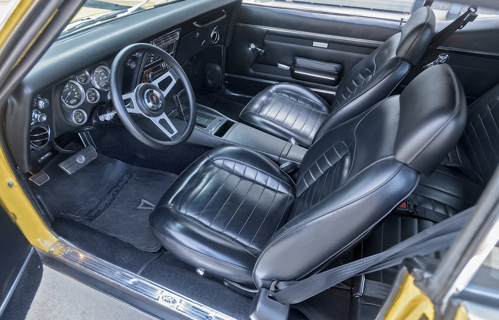 Introduced during the height of the pony car era under John Z. DeLorean’s leadership, the Firebird distinguished itself with a split grille, recessed quad headlights and sculpted body lines. This example retains the model’s recognizable profile but has been refinished in yellow with black stripes, replacing its original Primavera Beige paint. The interior, originally trimmed in Gold Strato-Bucket seats, now features recovered black vinyl seating and updated finishes.