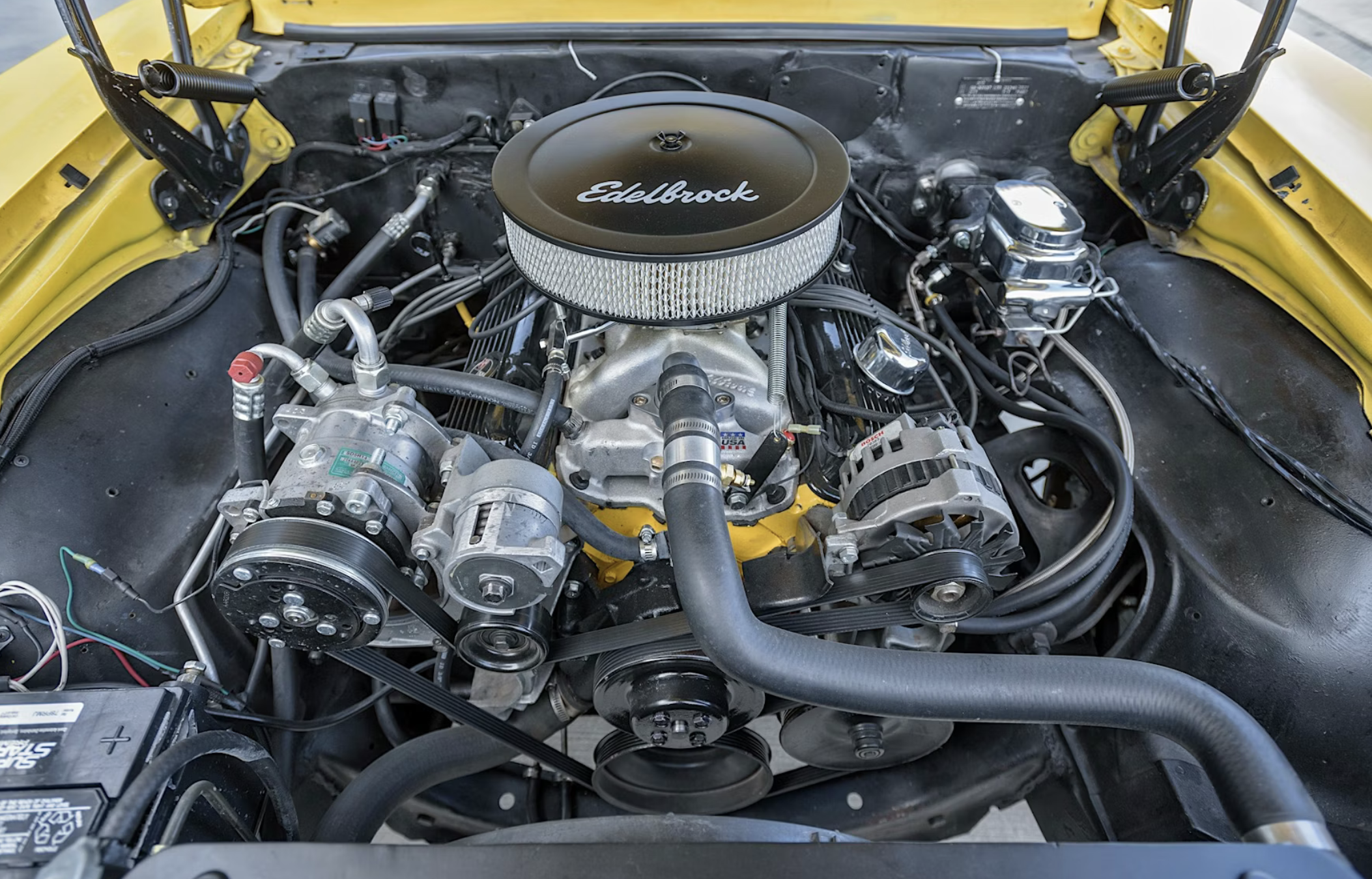 Power comes from a replacement 350-cubic-inch V8 reportedly sourced from a 1982 Corvette and said to have had 10,000 miles at the time of installation. The engine features an Edelbrock aluminum intake manifold, four-barrel carburetor, HEI distributor, serpentine drive system, aluminum radiator with electric fan and dual Magnaflow exhaust. A 700R4 four-speed automatic transmission with overdrive handles shifting duties.