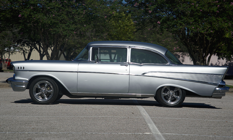 The '57 Chevy Bel Air stands out even among classics. Its distinct features, ranging from its prominent bumper to its iconic fins, make it an enduring symbol of its era. This particular piece is an expertly restored gem, shining in a refined shade of the original Inca Silver and complemented by a Dark Grey interior. Beyond its vintage appeal, this Bel Air boasts modern enhancements. Under its hood, it houses a robust 350ci carbureted crate engine paired with a manual transmission. Plus, it's equipped with contemporary comforts: air conditioning, power steering, power windows, and state-of-the-art four-wheel disc brakes.