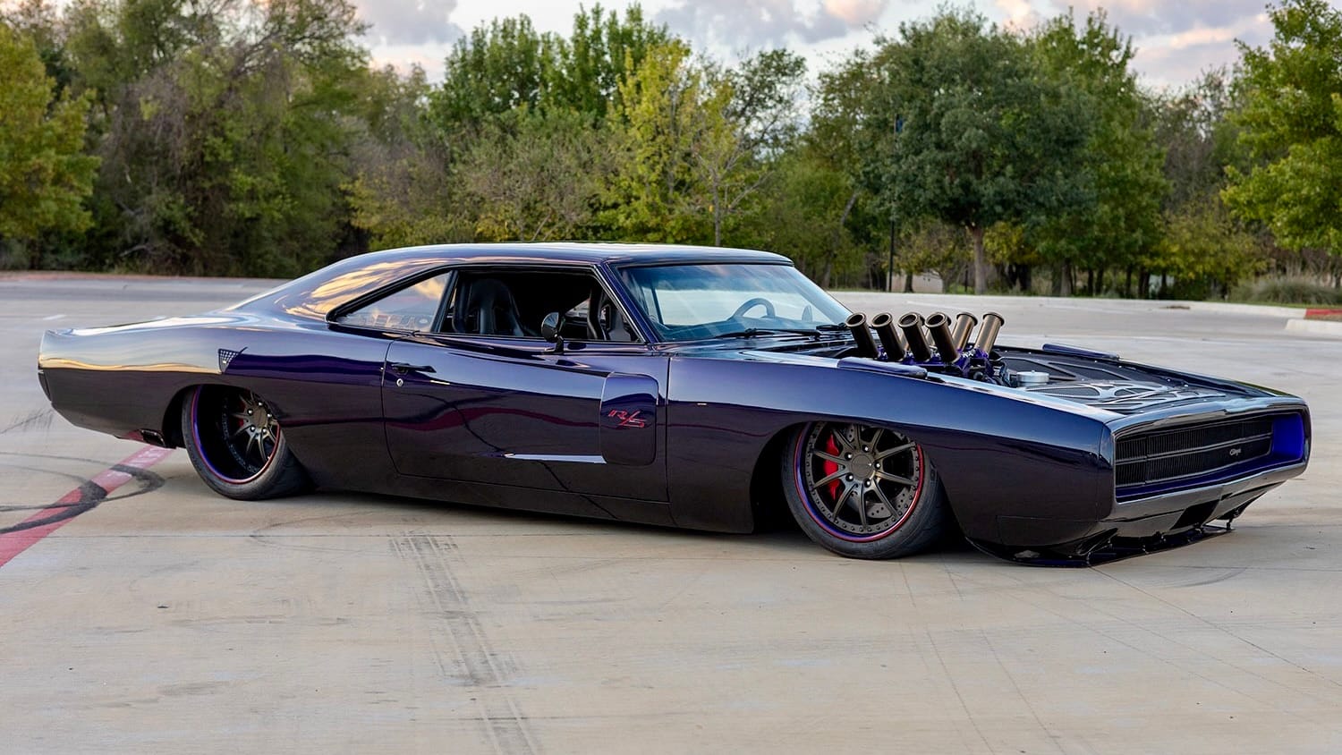 Visually, the Charger departs dramatically from stock form while preserving its unmistakable identity. Finished in Voodoo Violet Candy paint, the body features a three-inch roof chop and a three-inch body section for a lowered, more aggressive stance. Custom wheel tubs, a smoothed firewall, a reworked engine bay, and reshaped quarter-panels flowing into the decklid highlight the depth of fabrication involved. The car rides on 19-inch Lightspeed Racing wheels wrapped in 13-inch-wide Toyo Proxes tires.