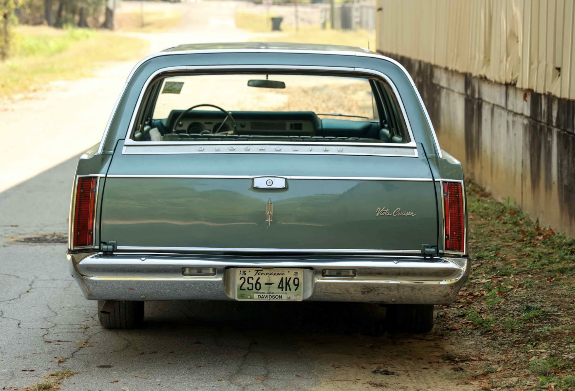 Finished in Light Jade over two-tone green vinyl, this four-door wagon is powered by Oldsmobile’s 330-cubic-inch Rocket V8 paired with a Jetaway automatic transmission. The car’s most distinctive feature—a raised roofline with panoramic glass panels above the second row—gave it an airy, futuristic feel decades ahead of its time. Other period touches include quad headlights, chrome trim, and seating for up to six passengers.