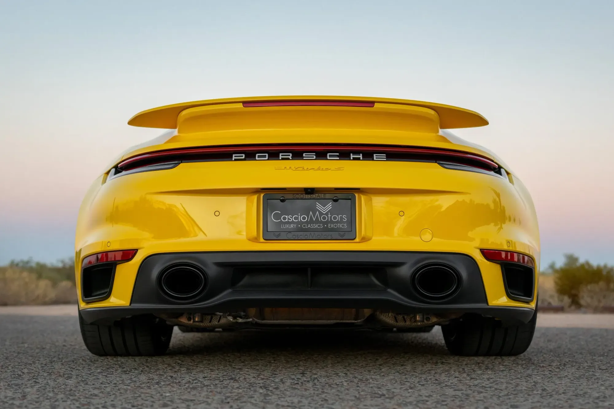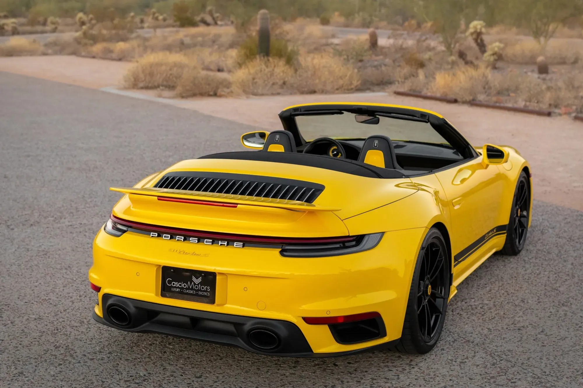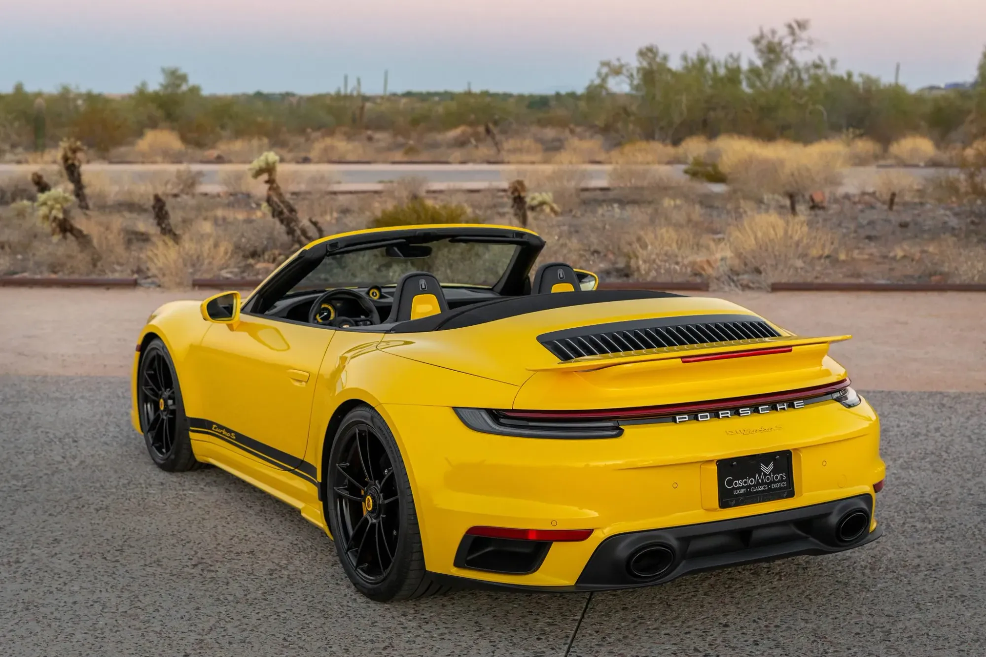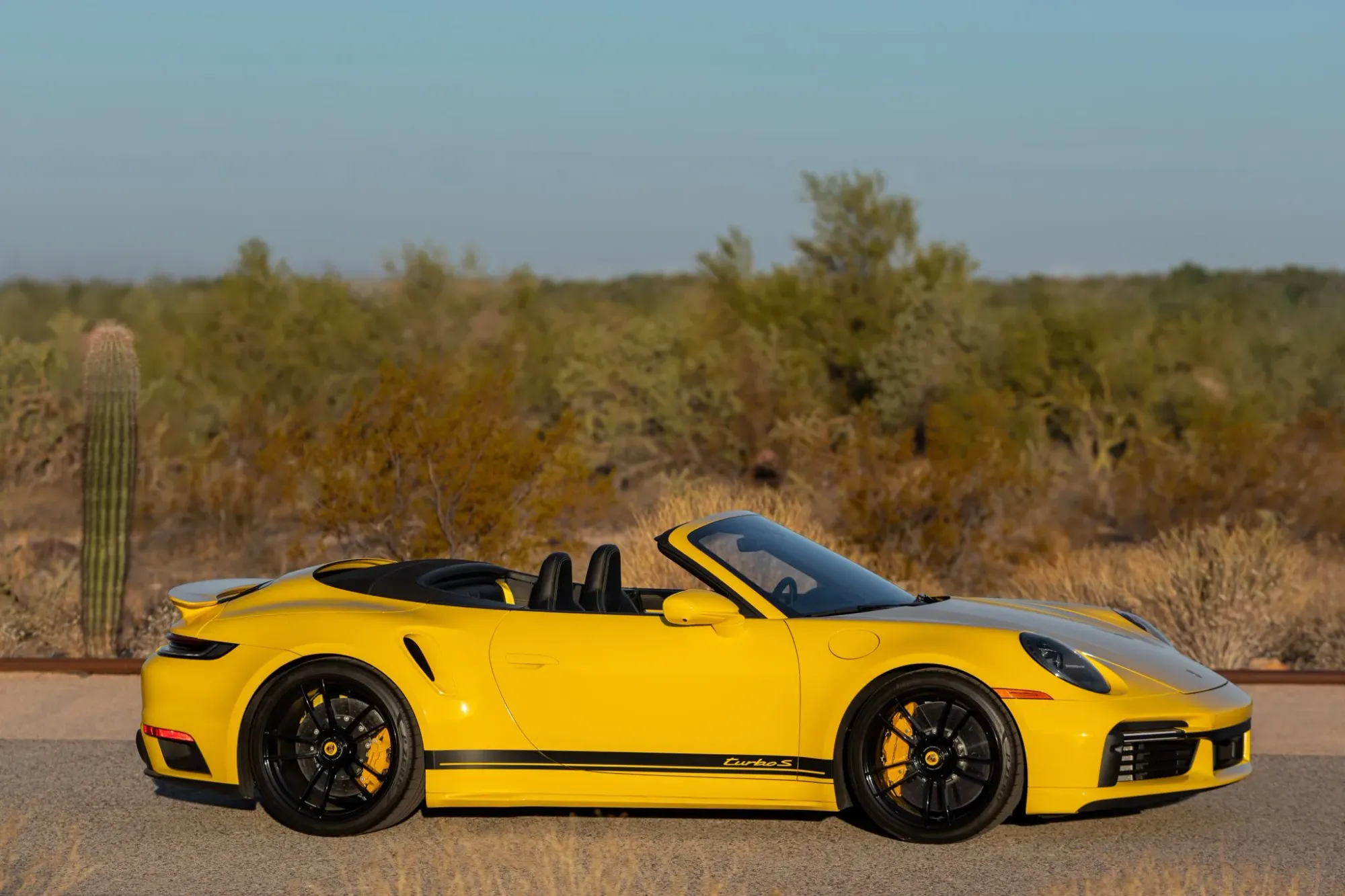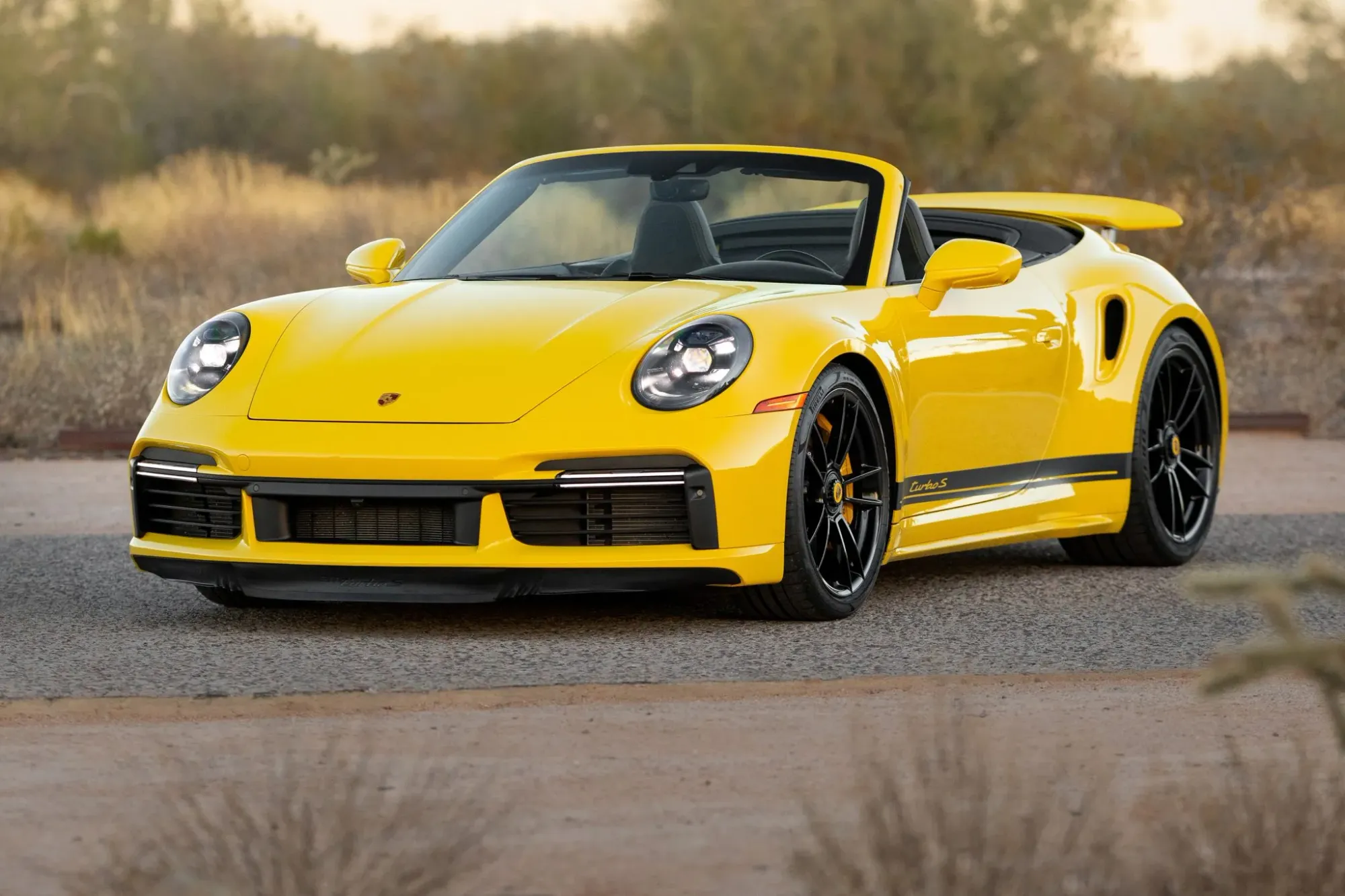 Low-mileage 2021 Porsche 911 Turbo S Cabriolet with 640hp, Racing Yellow finish, and extensive factory options offered at no reserve.