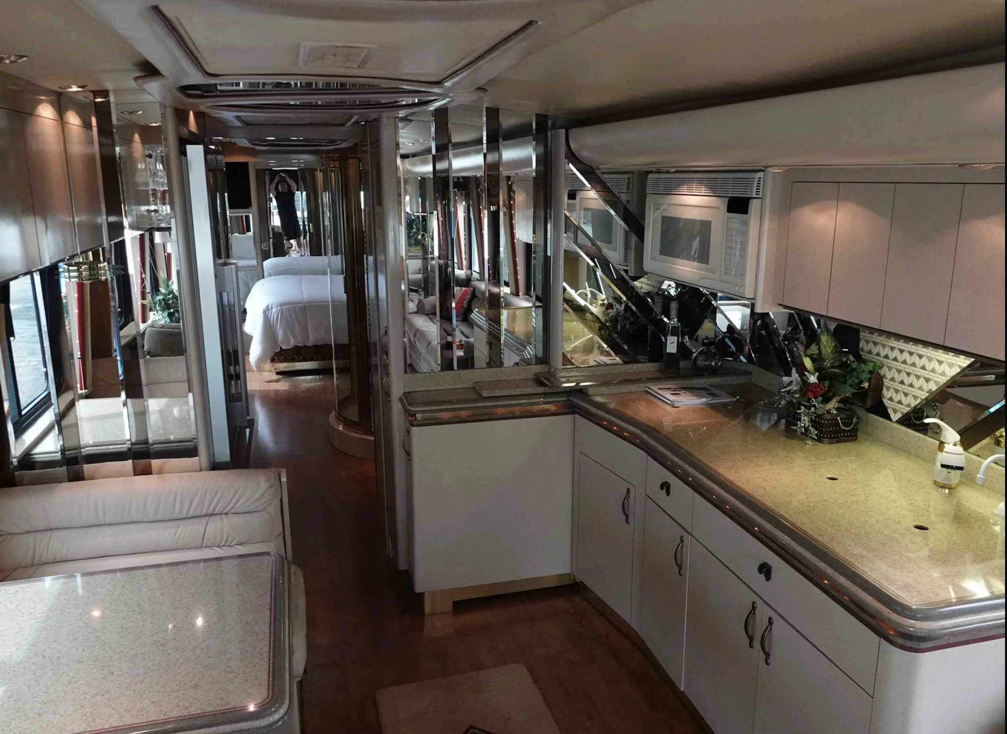 Inside, the motorhome offered high-end appointments uncommon even by modern RV standards. A tan leather interior, solid wood cabinetry, quartz countertops, a Fischer & Paykel full-size refrigerator, and a queen-size bedroom highlighted its luxury. Entertainment came via a Sony audio system with Bose speakers, while rooftop air conditioning and privacy window shades provided comfort.