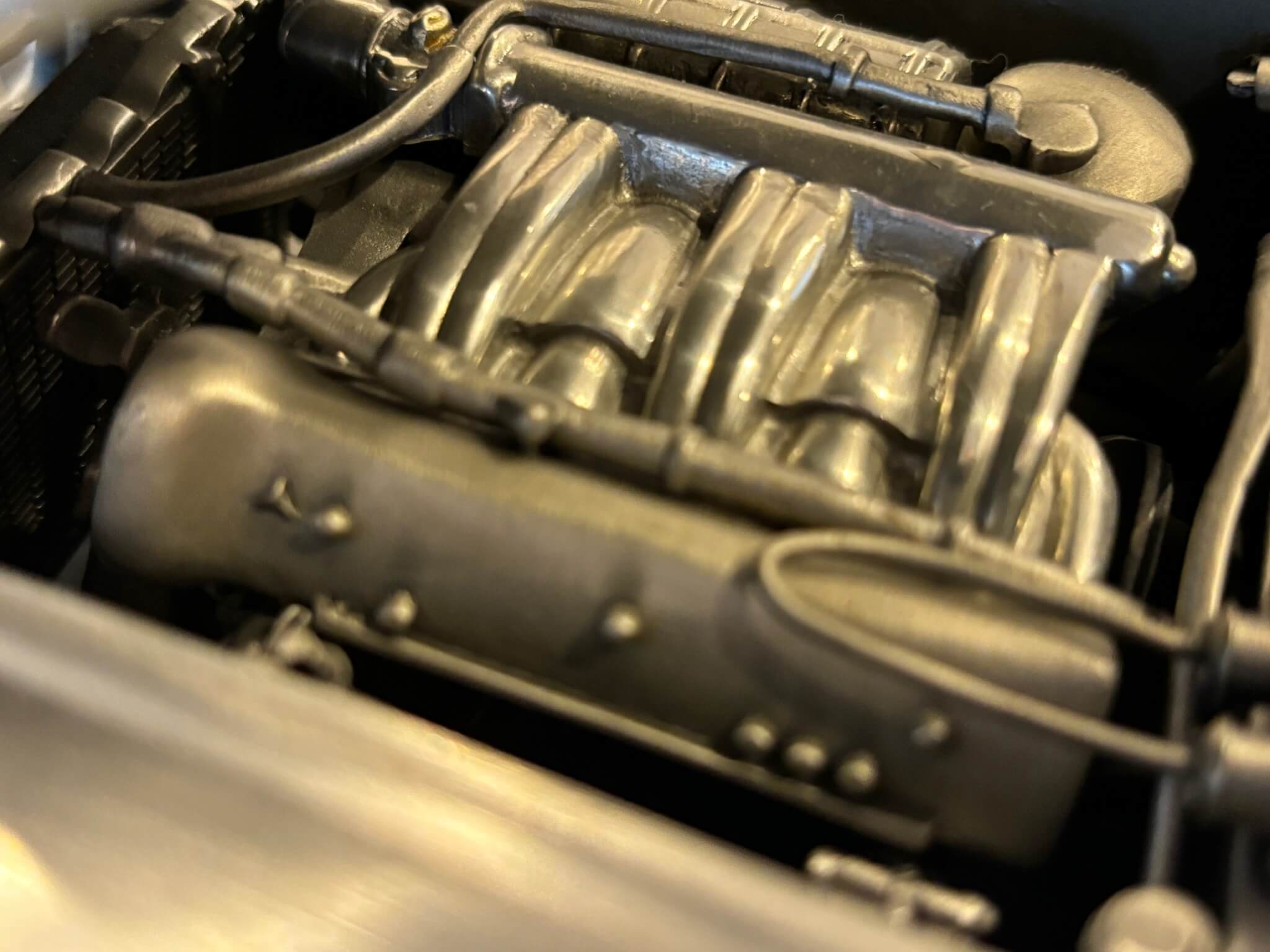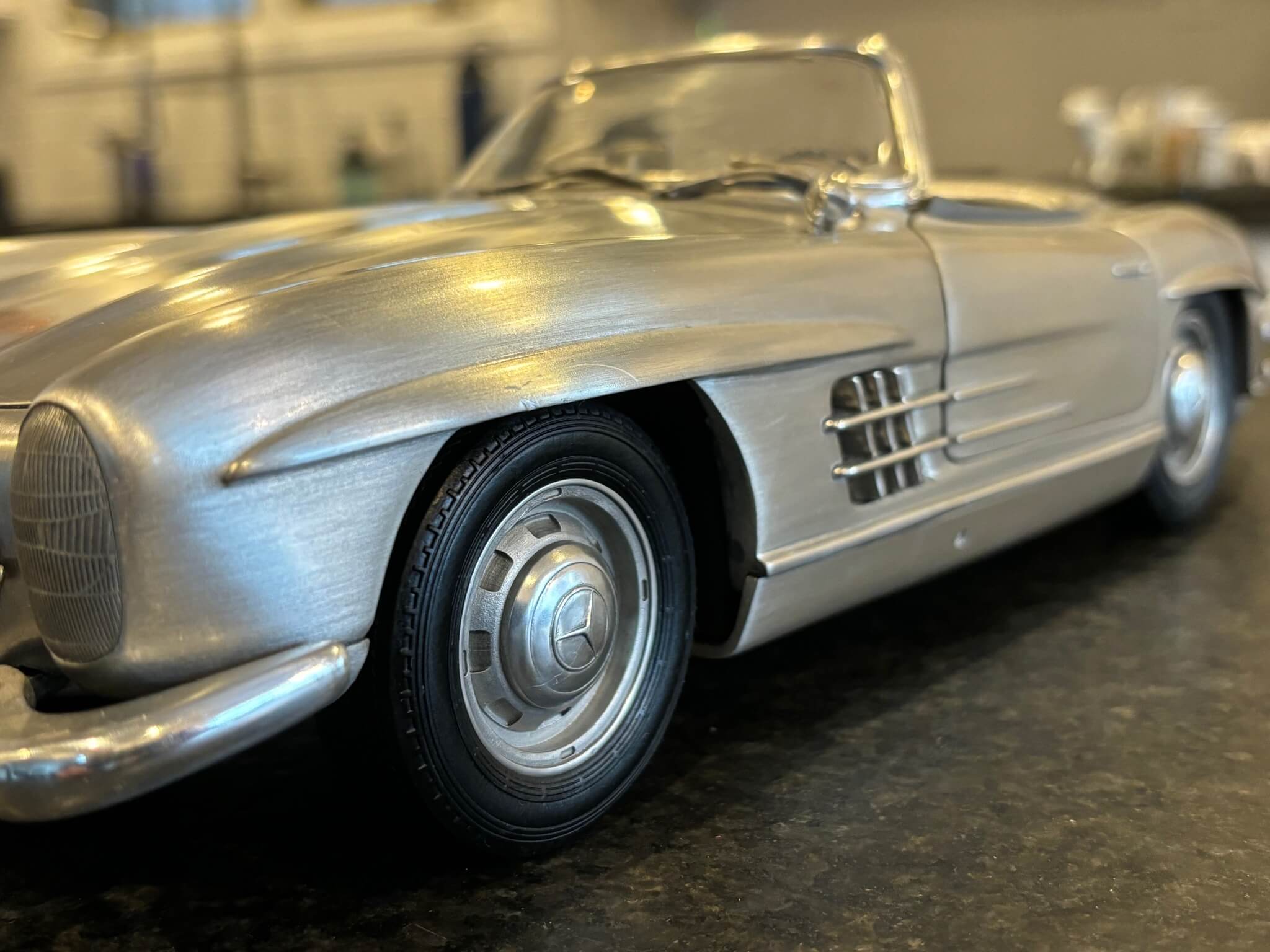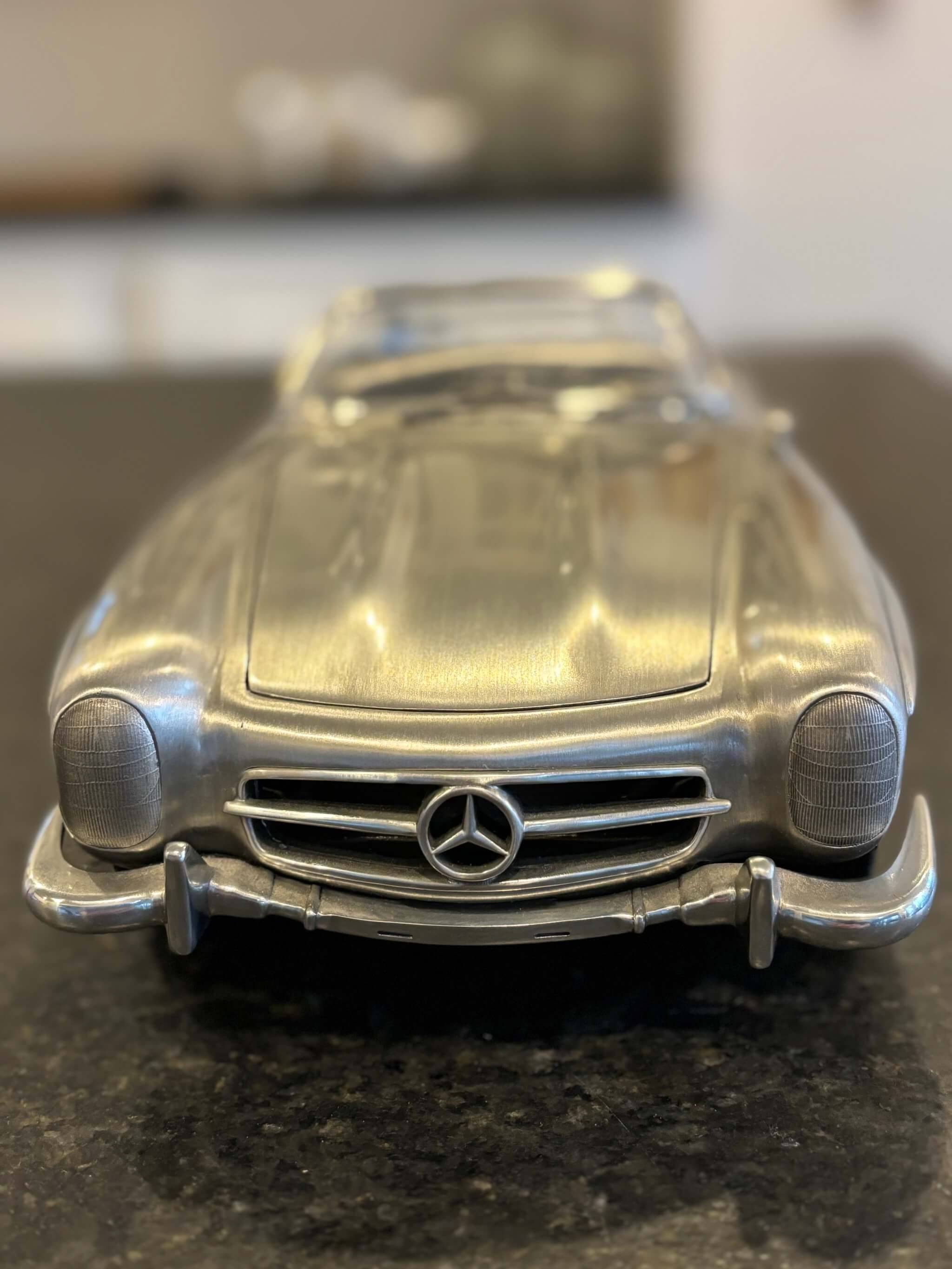 Constructed from solid pewter and weighing approximately 15 pounds, this model captures the essence of the legendary 300SL with remarkable attention to detail. From the dashboard gauges and switchgear to the chromed door handles and comprehensive engine bay, each feature is meticulously replicated to honor the original vehicle's legacy. The seats, upholstered in genuine leather, and the rubber tires add a touch of realism and luxury, while spring-loaded doors, a forward-opening hood, and a plastic windscreen further enhance its authenticity.