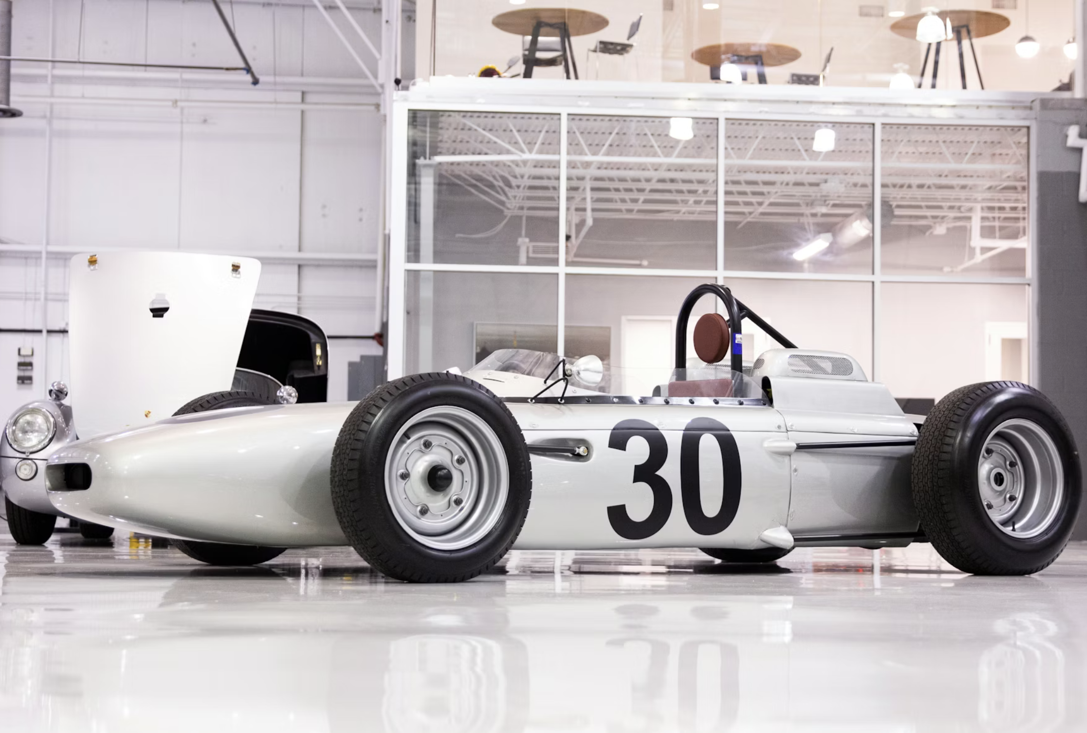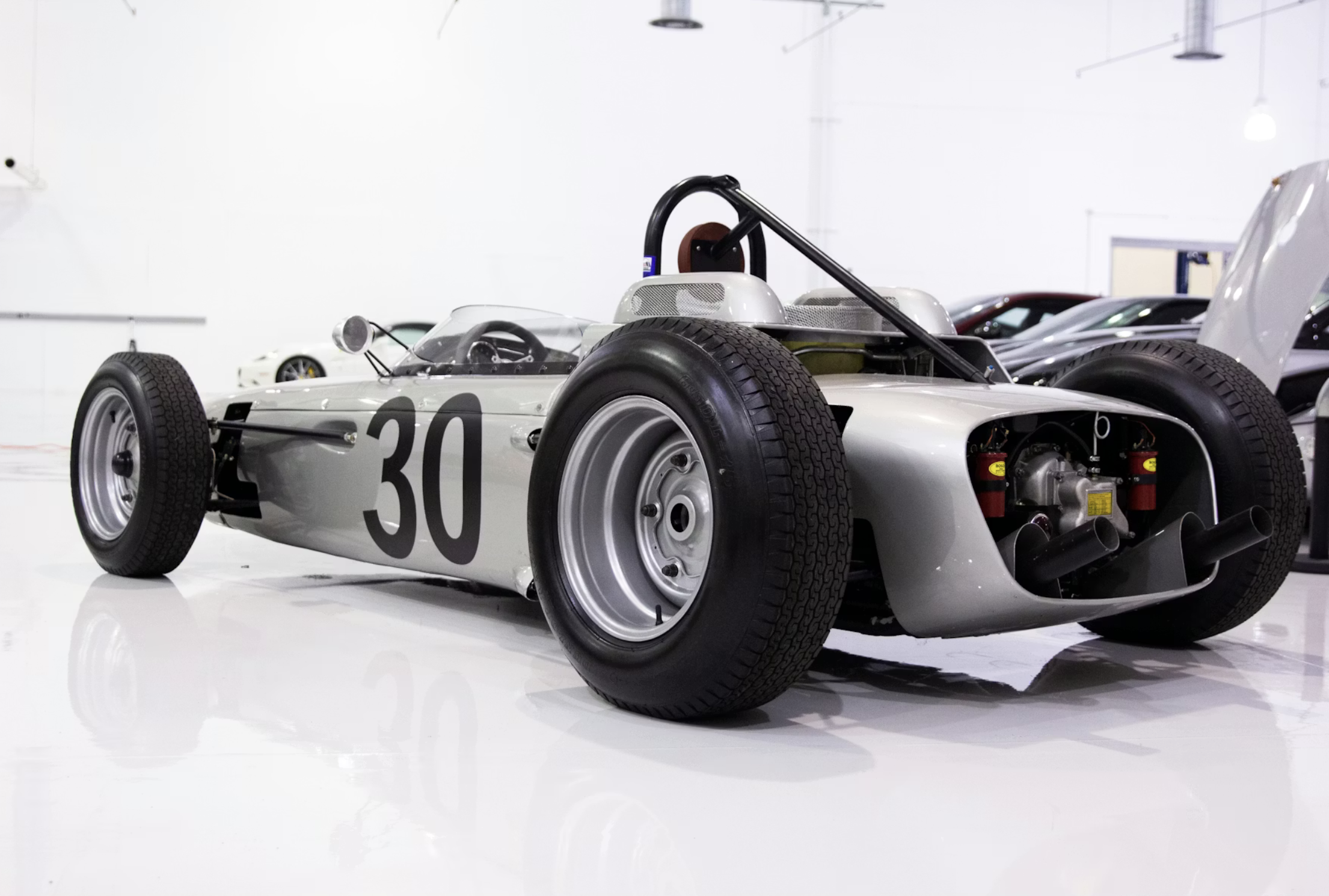 This modern recreation was built by the Wilson Collection in Jupiter, Florida, with a focus on preserving the look and spirit of the original design. The car features a hand-formed aluminum body finished in silver and carries the recognizable number associated with its historic racing counterpart. Its lightweight construction is based on a tube-frame chassis, echoing the engineering approach of the early 1960s.