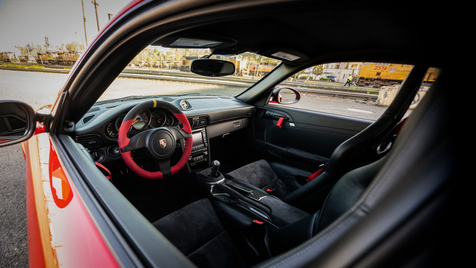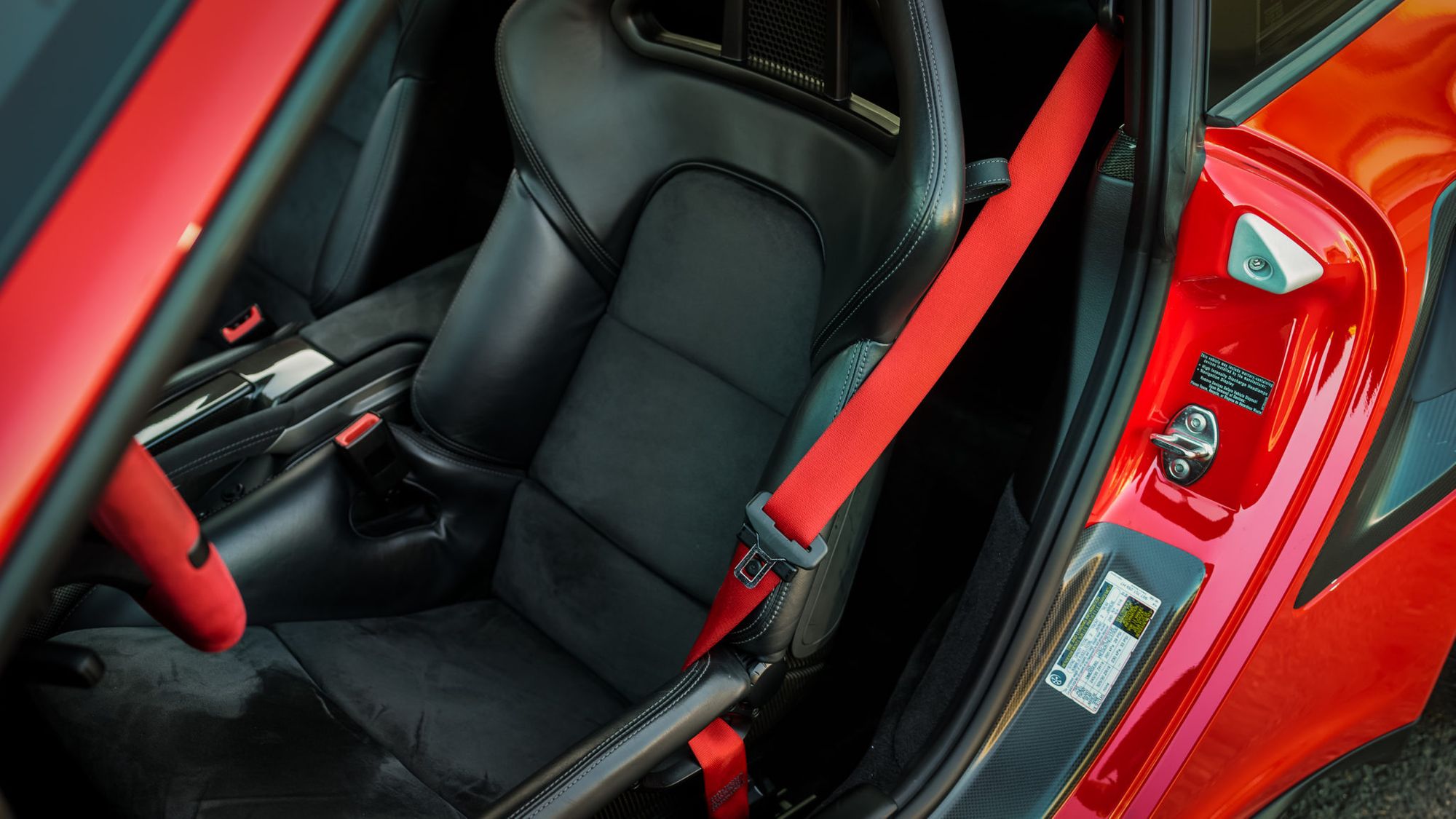 Finished in a brilliant Guards Red with a black contrasting hood decal, the mean GT2 RS was given plenty of lightweight carbon fiber components such as the hood, optional front fenders, side intakes, and rear diffuser. This example features the lightweight headlights and Porsche-exclusive clear taillights. Even the door skins are made of lightweight aluminum. According to the description, Xpel paint protection film was installed over the bumper, front fenders, hood, and mirrors. For the carbon fiber, a matte finish was applied so it shows in the correct finish. A set of black forged center-lock wheels (19x9 front, 19x12 rear) wrapped with Michelin Pilot Sport Cup 2 rubber (245/35 front, 325/30 rear) sit on all four corners. Behind the wheels are Porsche Ceramic Composite Brakes (PCCB) with six-piston calipers up front and four-piston calipers in the back all in a red finish.