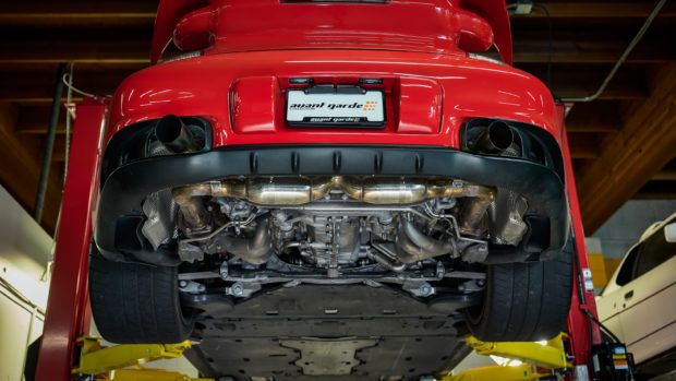 Powering the car is a twin-turbocharged 3.6-liter Mezger flat-six engine with VarioCam Plus capable of 612-horsepower at 6,500-rpm and 516 lb/ft of torque at 2,250-rpm. Shifting that power down to the rear wheels is a 6-speed manual transaxle with a factory limited-slip differential and oil cooler system. The previous owner modified the car with a Fabspeed ECU tune, Fabspeed cat-less exhaust system with headers, a lightweight flywheel, and Sachs clutch kit. Suspension duties are handled by MacPherson struts up front that works with a multi-link setup out back. Standard for this car is Porsche Active Suspension Management (PASM).