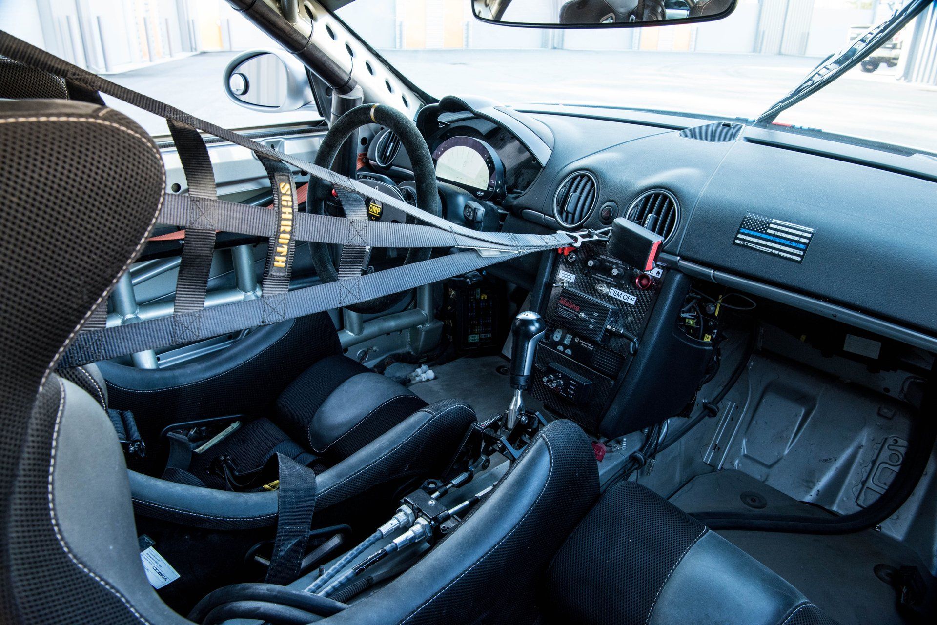 With the exception of this splitter and spoiler, the Cayman looks about as stock as they came from the factory, and that's part of the rule books. Inside, it's a totally different story with an interior that you'd expect from any modern racecar. That includes a custom roll cage, safety net and racing seats as well as a fire suppression system, digital data acquisition and an in-car track camera.
