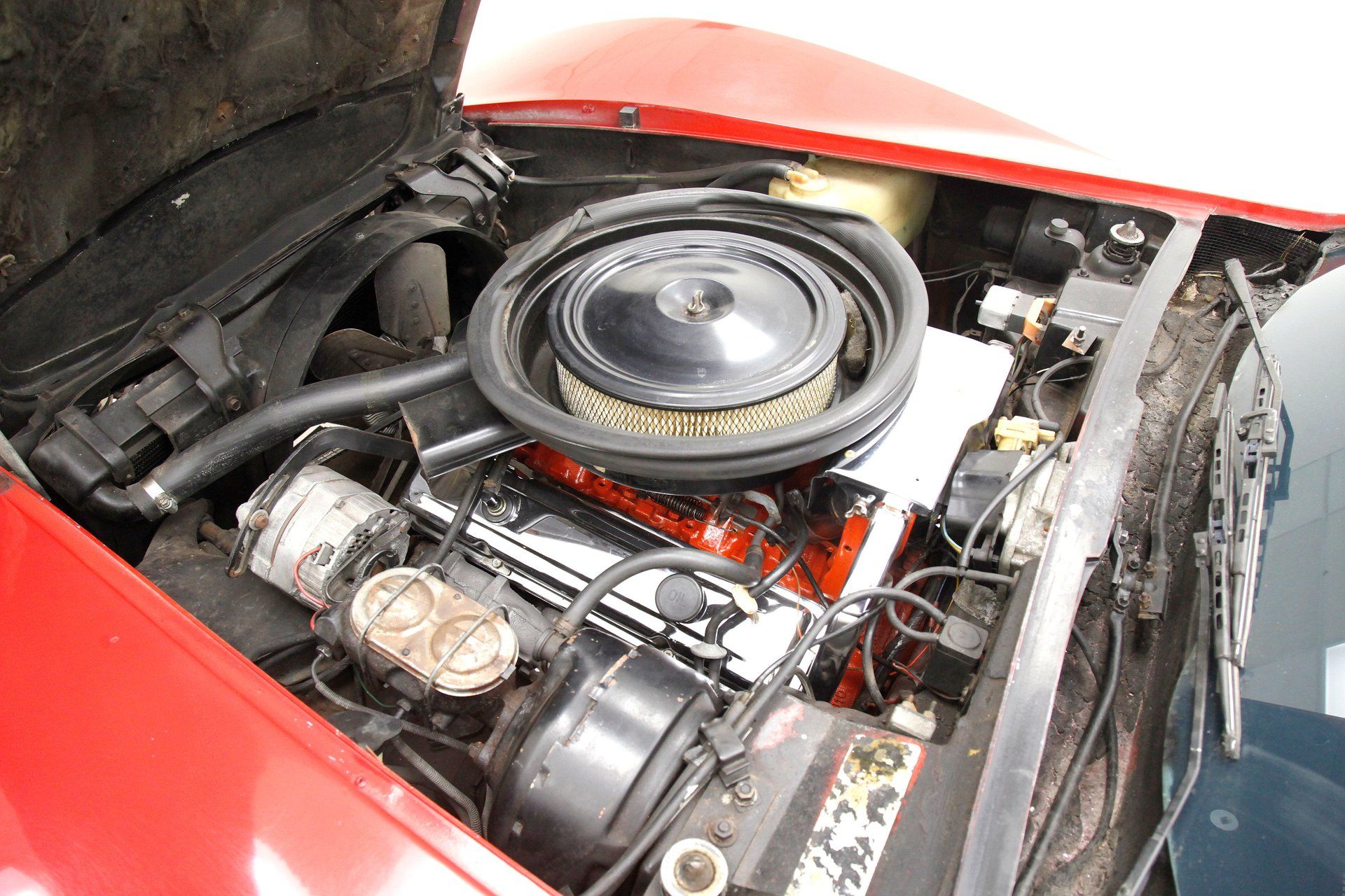 The example seen here is powered by the base L48 350 cubic inch V8 and backed up by a three-speed automatic transmission. It looks simply terrific in red on red with a white top. Rallye wheels wrapped with white letter tires complete the look.