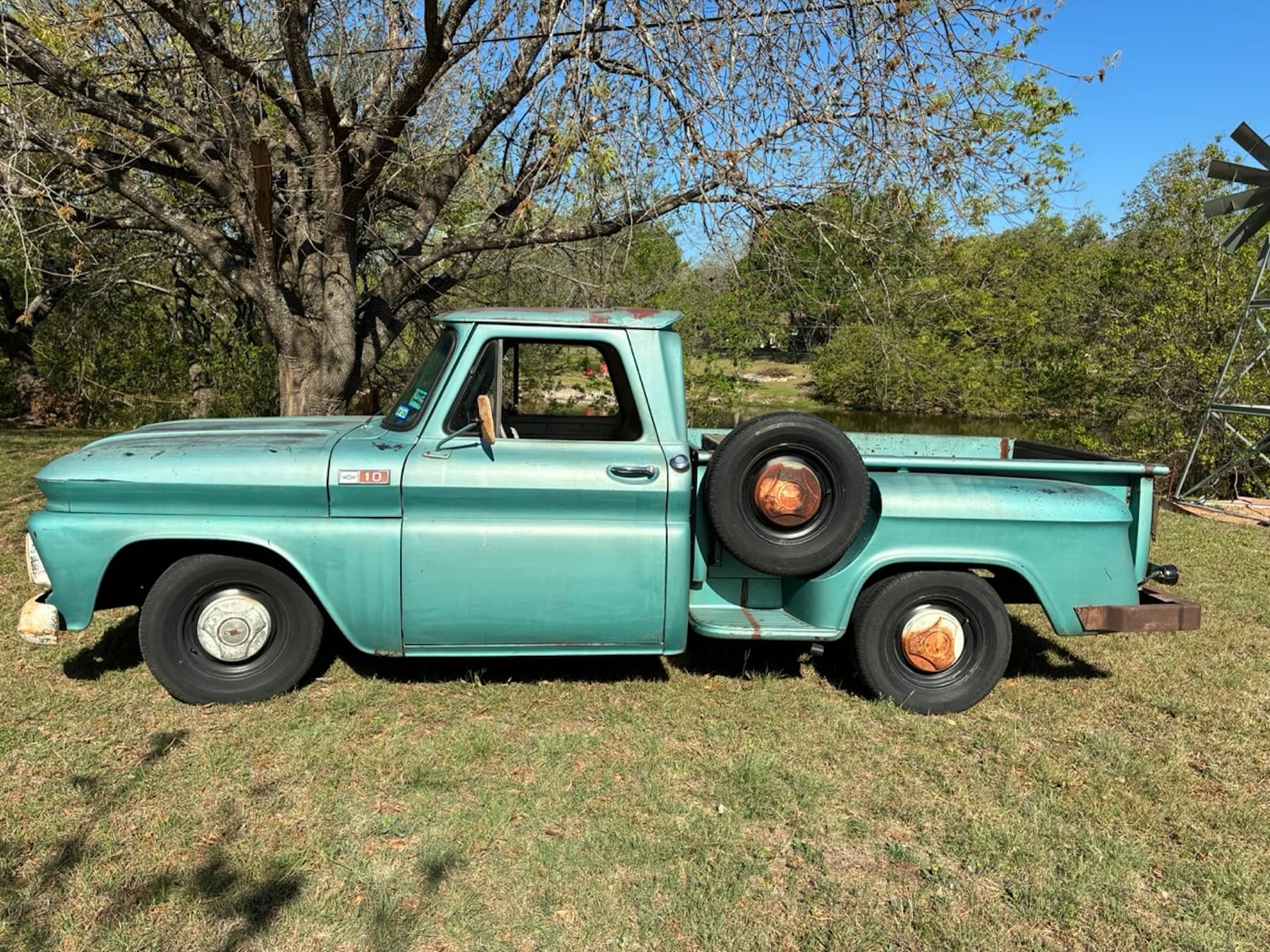 Visually, the C10 maintains a weathered appearance, with faded teal paint and visible signs of age, including chipped surfaces and corrosion in exposed areas. The exterior retains classic elements such as 15-inch steel wheels, a Stepside bed, and an embossed tailgate. Inside, the cabin features a bench seat and teal carpeting, though wear is evident in the upholstery and interior trim.