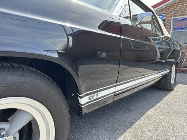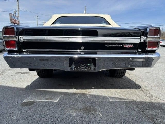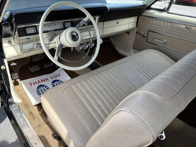 The vehicle, finished in a black exterior paired with a white convertible top, maintains the iconic look of late-1960s American automotive design. Inside, a cream-colored interior complements the exterior, offering a clean and period-consistent aesthetic that underscores the car’s vintage appeal.