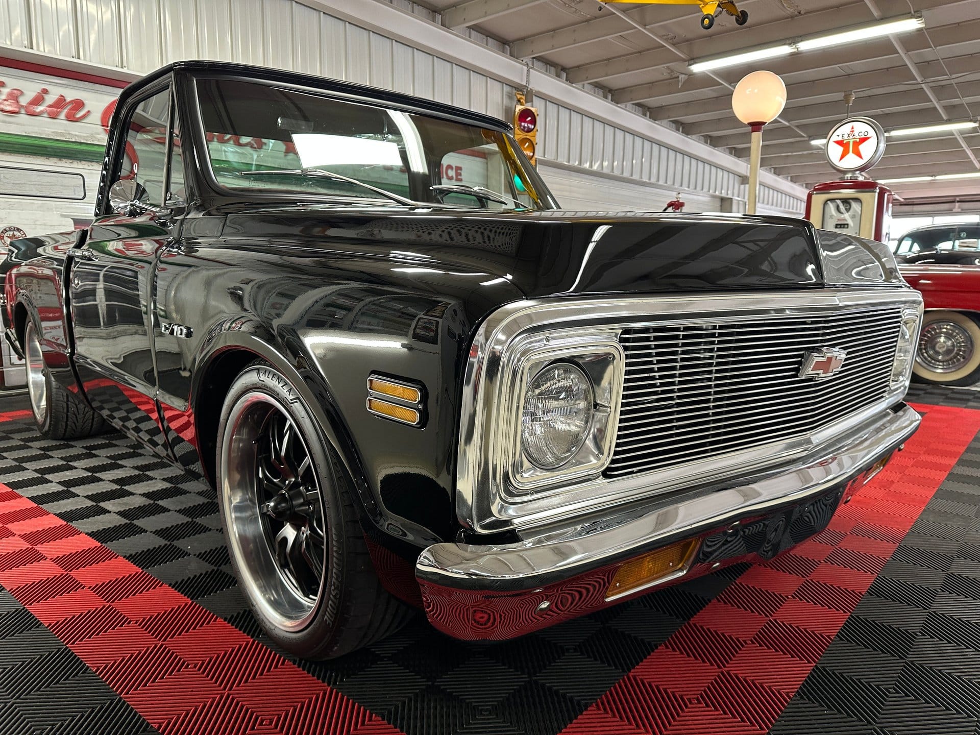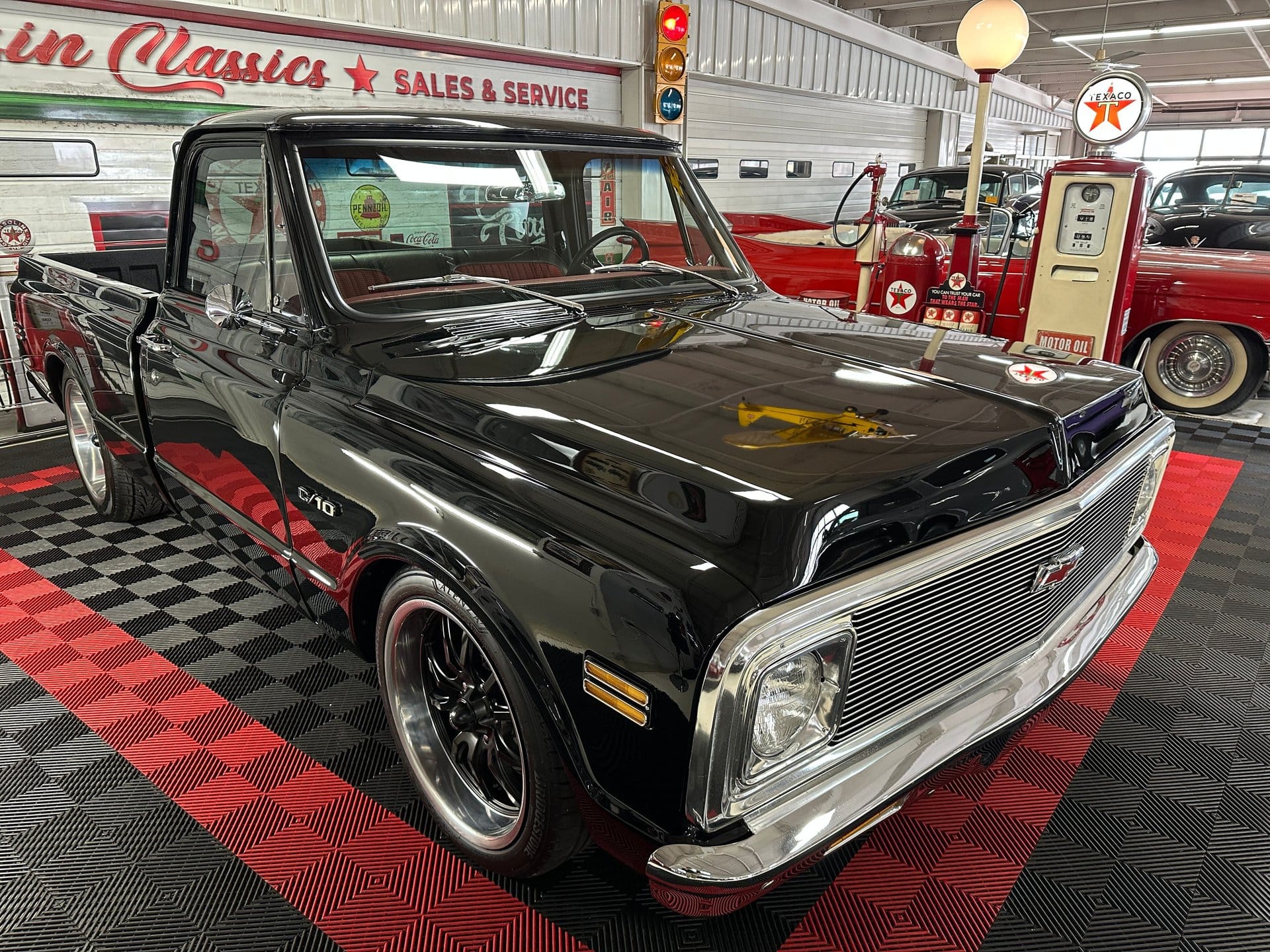 Part of Chevrolet’s “Action Line” series, this Fleetside model stands out with a deep black finish that has been recently ceramic-coated to enhance its shine and durability. The exterior combines classic styling with subtle custom touches, including a horizontal bar grille, chrome bumpers and extensive brightwork that contrasts sharply against the dark paint. The truck’s lowered stance and 20-inch Ridler wheels add a contemporary edge, while performance-oriented details such as visible red brake calipers hint at its upgraded mechanical capabilities.