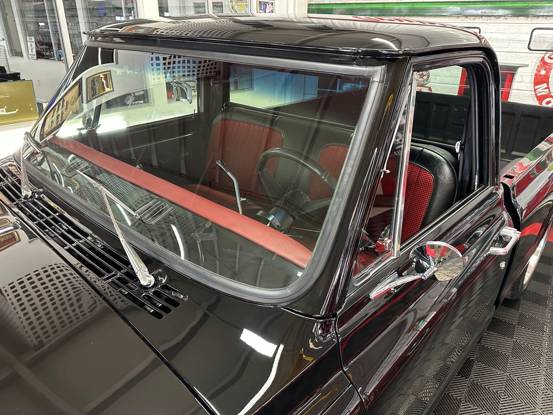 The interior reflects the same level of attention to detail, combining classic design elements with modern upgrades. A black and red color scheme defines the cabin, highlighted by a bench seat featuring red houndstooth inserts. The dashboard retains a traditional layout but incorporates additional gauges for improved engine monitoring. A modern audio system with Bluetooth capability and a Vintage Air system provide updated comfort and convenience.