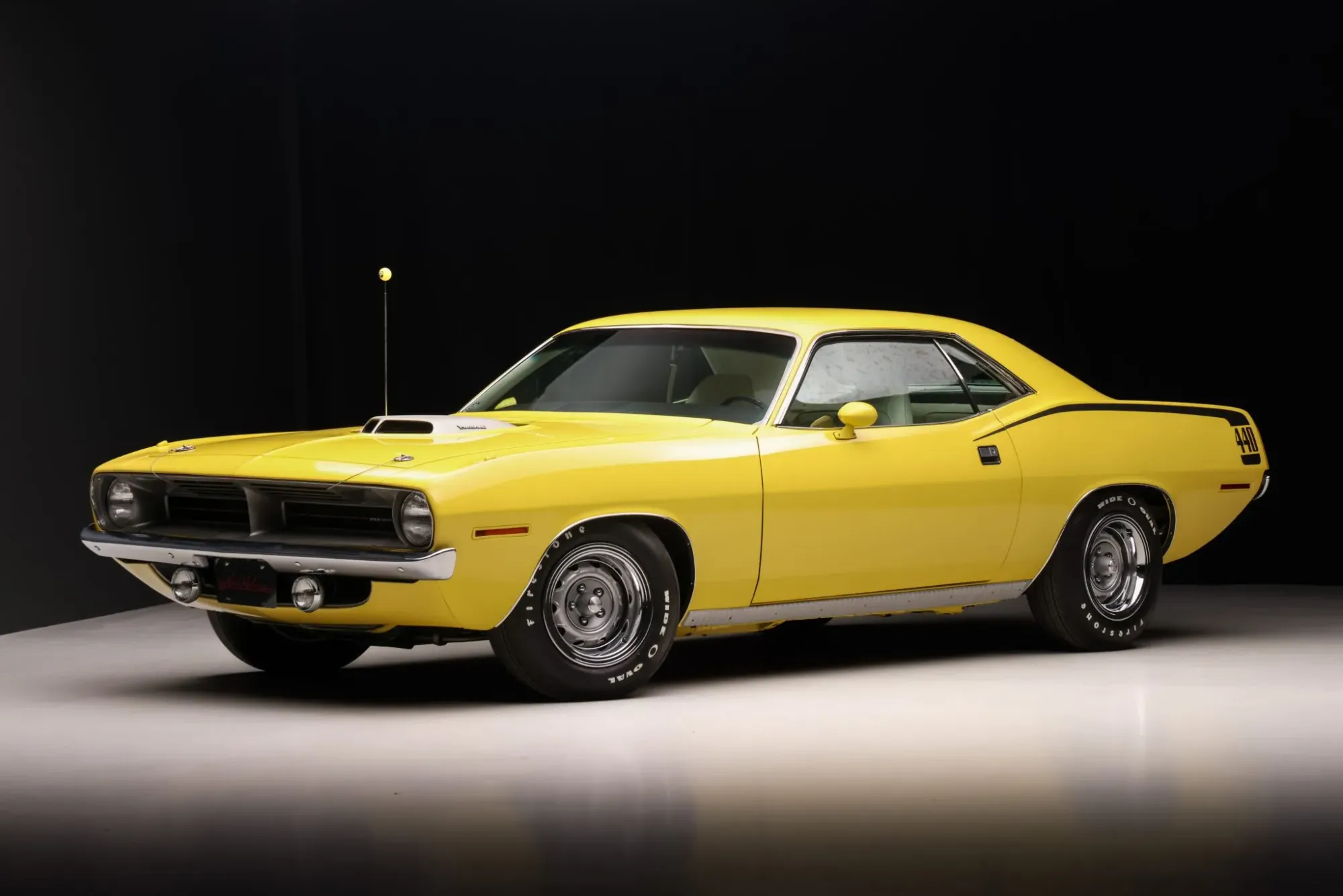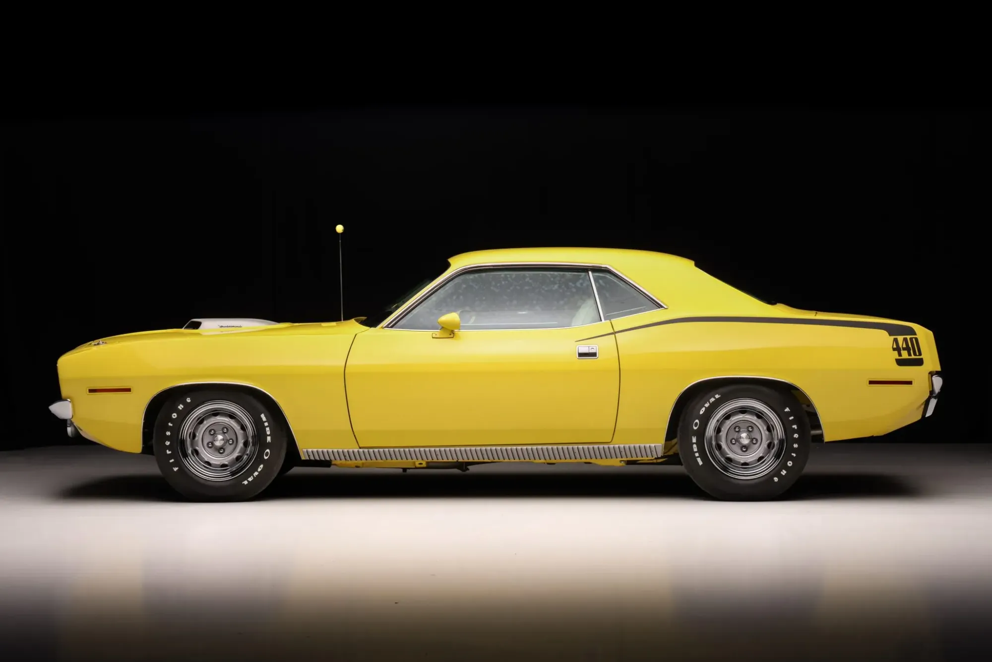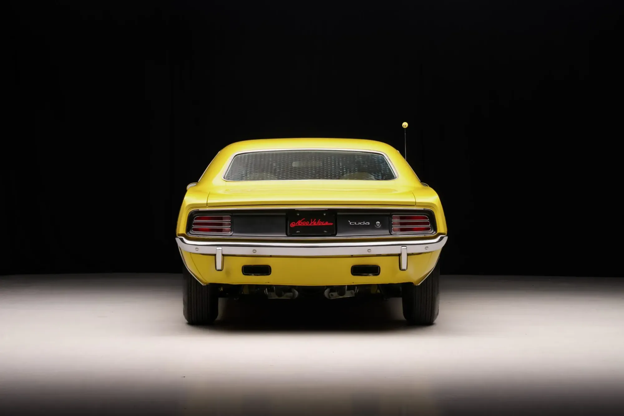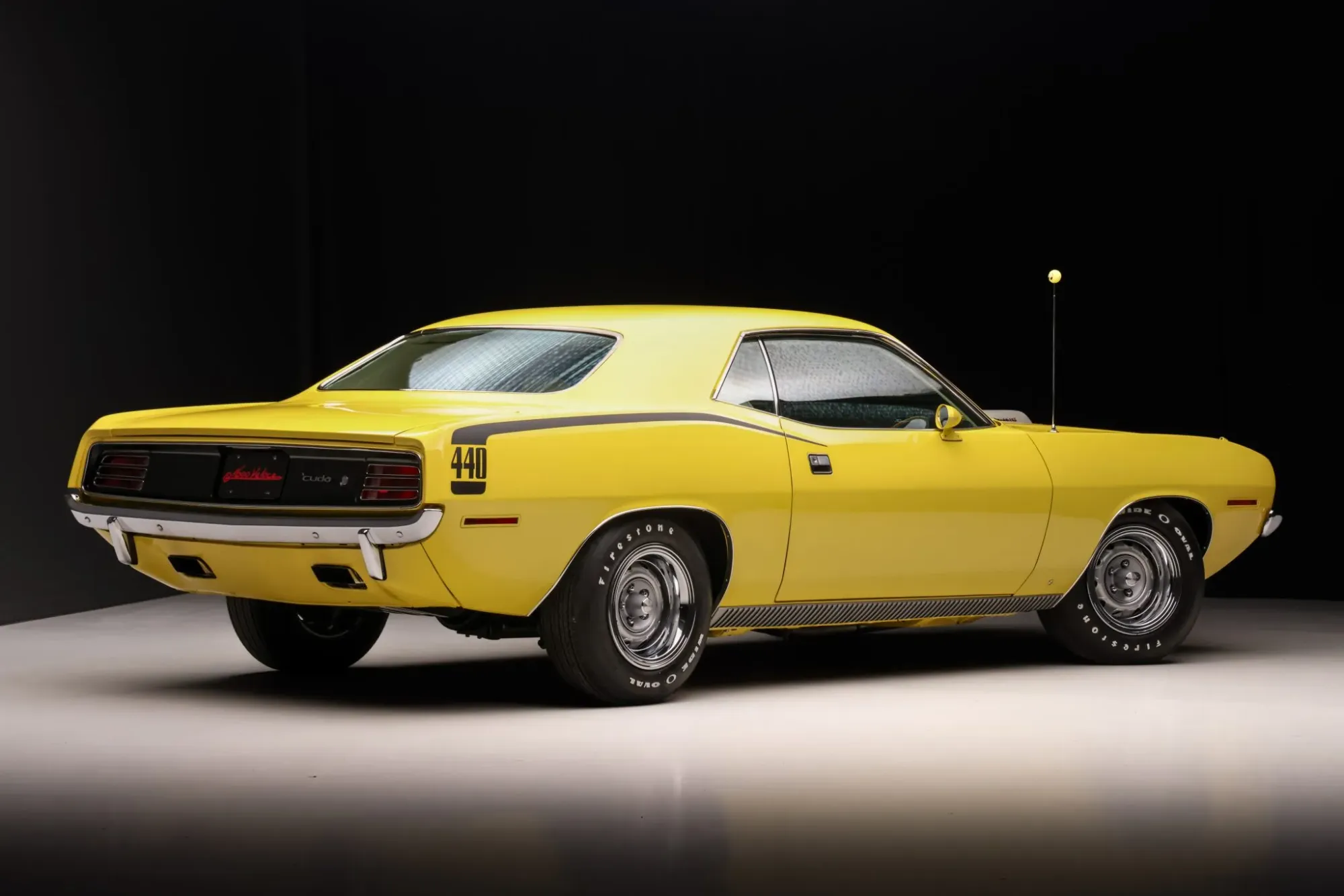 Originally finished in Lemon Twist (FY1), this 'Cuda was meticulously stripped down and repainted as part of its major refurbishment, conducted by RJ Cars Inc of Arkport, New York. The addition of a Shaker hood and striking "hockey stick" black side stripes has enhanced its visual appeal. Chrome bumpers, fog lights, hood pins, and a sleek black tail panel complement its classic muscle car stature.