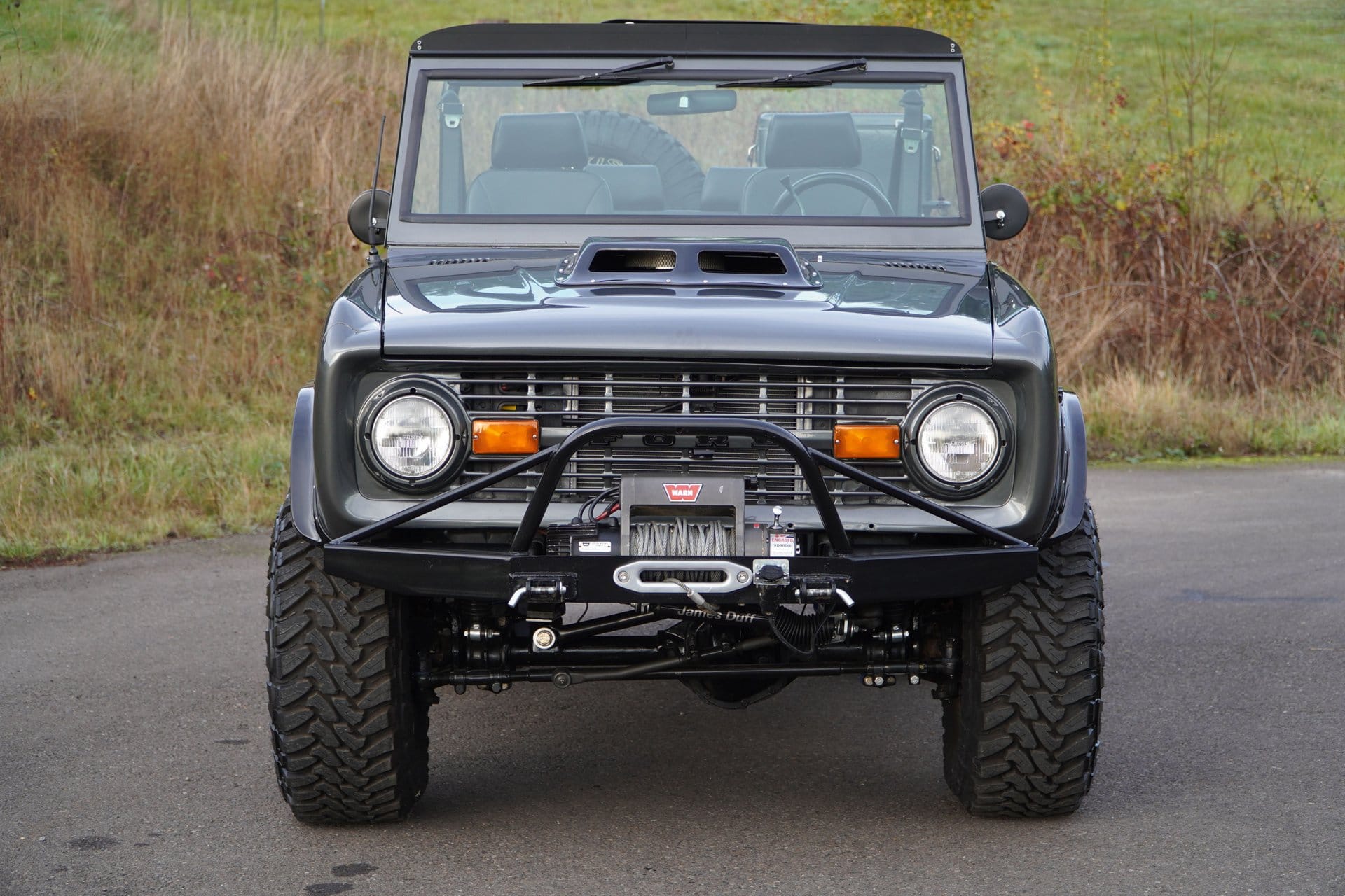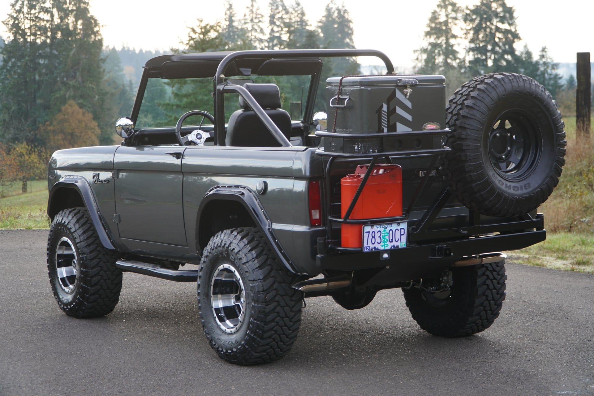 The Bronco’s exterior reflects its trail-ready purpose. A Warn winch and custom winch bumper provide recovery capability, while side steps and a Bimini top add utility for everyday use. At the rear, a custom rack holds a full-size spare along with mounts for a cooler and jerry can, making it easier to carry gear for longer outings.