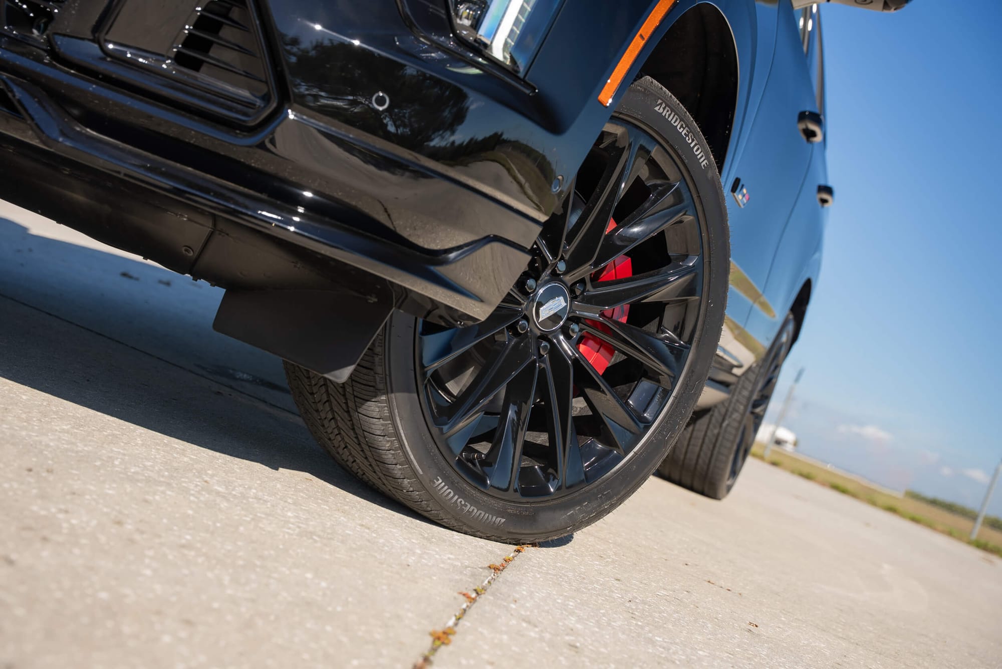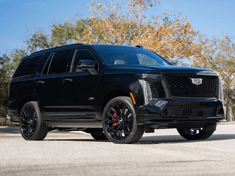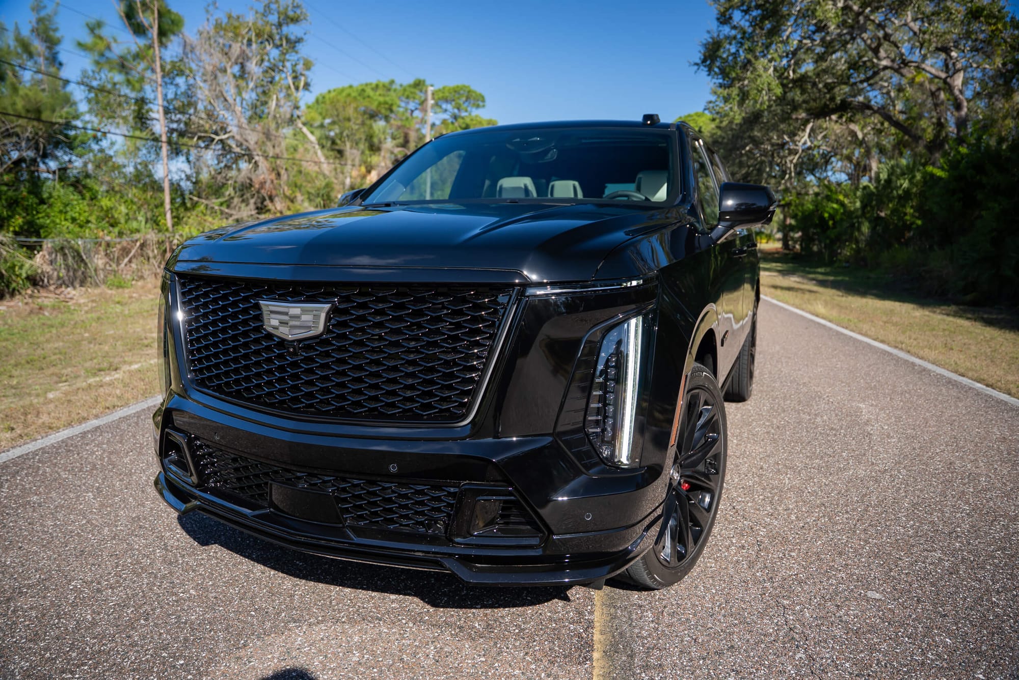 This Escalade-V is finished in Black Raven, a deep, menacing exterior color that perfectly matches its aggressive stance. Inside, the cabin is trimmed in Sheer Gray with Jet Black accents, wrapping all three rows in semi-aniline leather and high-end materials designed for both comfort and presence. Every seat is first-class.