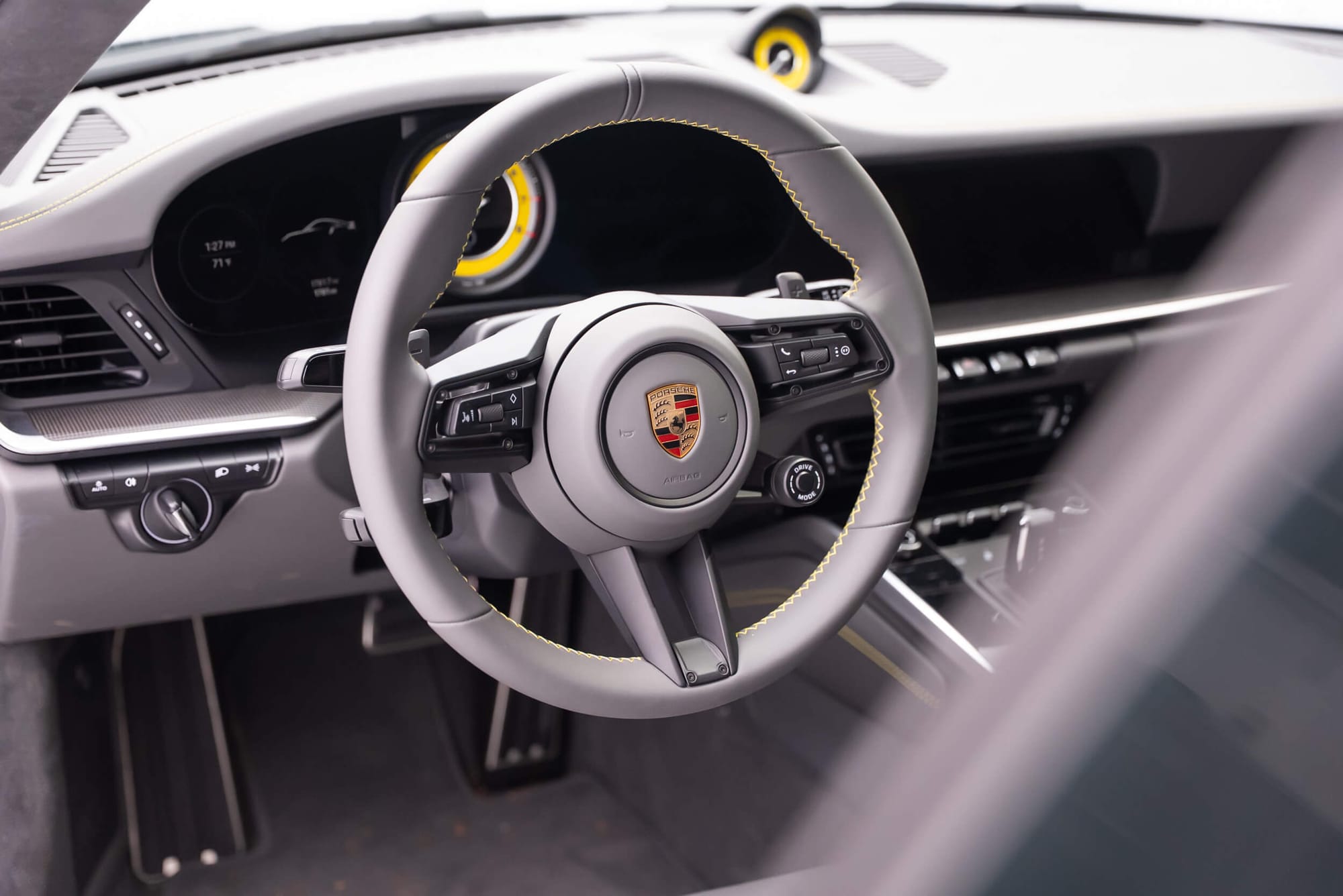 This particular car was specially ordered by Dream Giveaway Garage and comes loaded with high-end factory options. That includes the Sport Chrono Package, LED-Matrix headlights with PDLS+, a sport exhaust system, and a full suite of driver assistance features like Surround View and Lane Change Assist. Inside, you’ll find heated and ventilated seats wrapped in premium leather, along with illuminated accents that reinforce the Turbo S’s blend of luxury and performance.