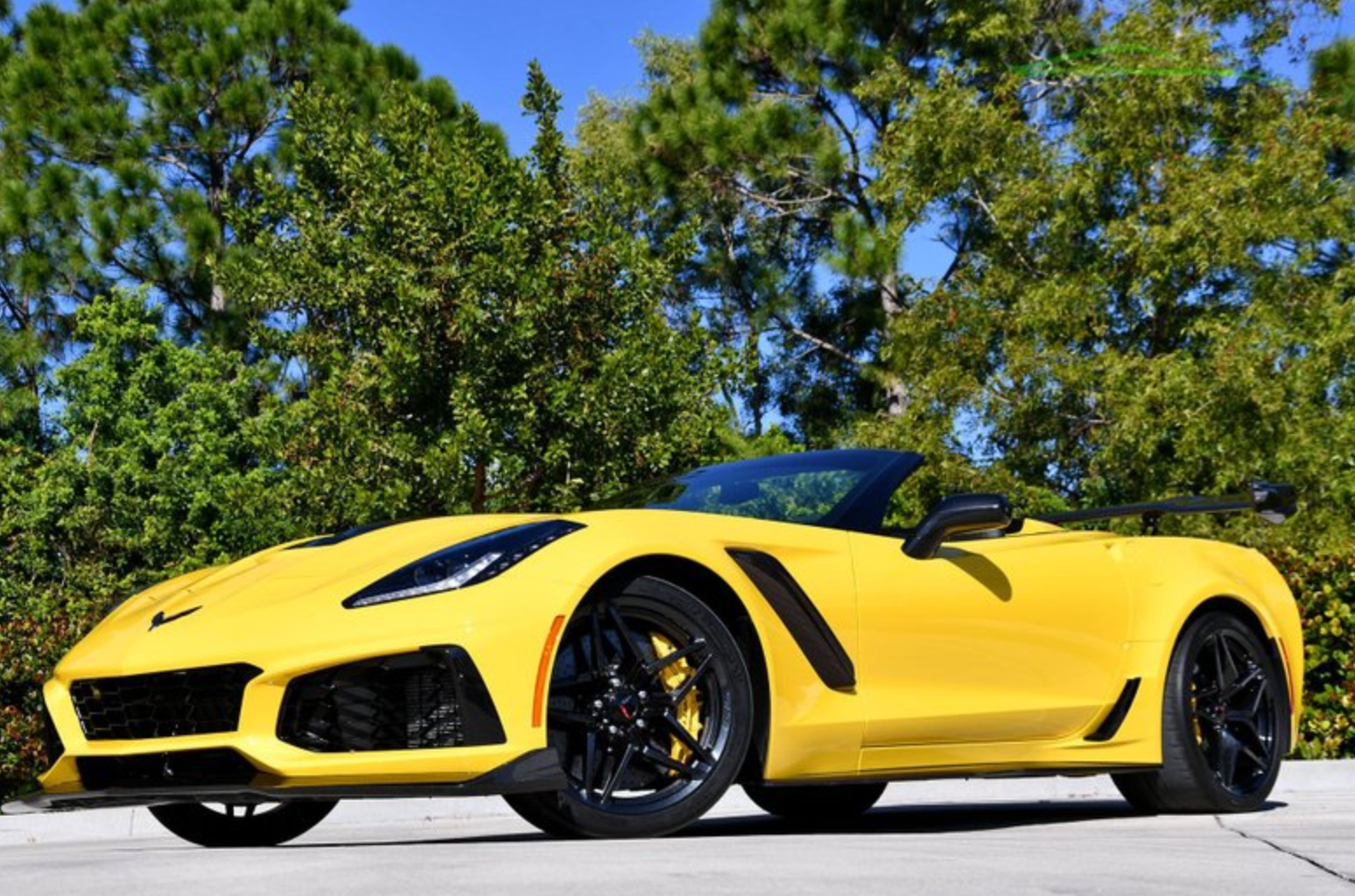 Awesome Joe Auctions is offering this incredibly rare 2019 Corvette ZR1 Convertible. It is 1-of-16 made in Corvette Racing Yellow and only 1-of-4 with a Suede Jet Black interior. Performance wise, it is one of the 265 convertibles produced with the ZTK Track Performance Package, which includes a performance ride and handling suspension, uniquely sized Michelin Pilot Super Sport Cup 2 run-flat tires, an adjustable high-wing spoiler, and specific front splitter end caps. This car is also only 1-of-17 ZR1 Convertibles with the 1ZR package.
