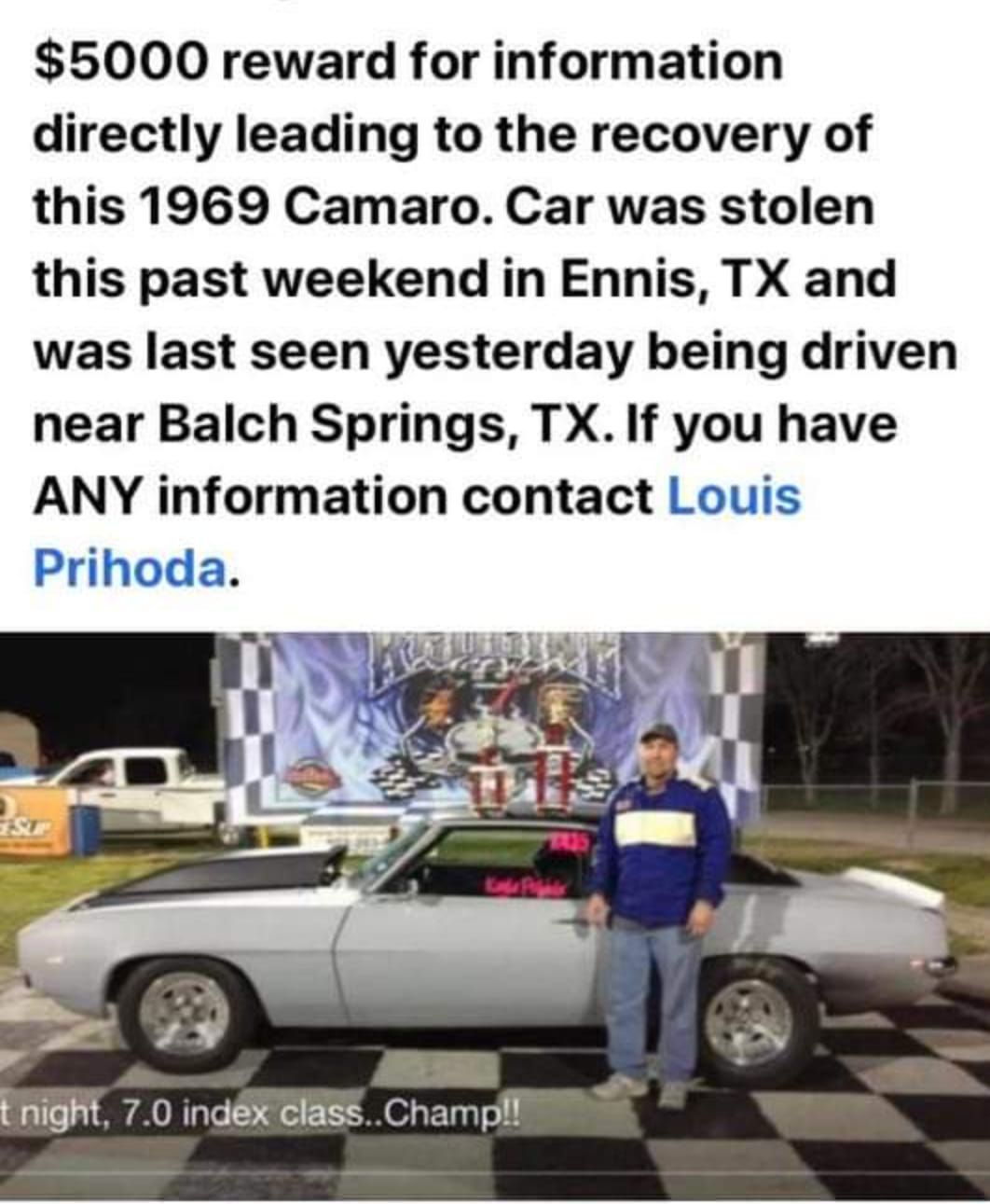 Louis Prihoda was in town for a race at the NHRA Bracket Finals. He returned to his LaQuinta Inn hotel room early in the morning after racing, and work up to find his Ford F-350 truck, Sparton trailer, and 1969 Chevy Camaro gone.