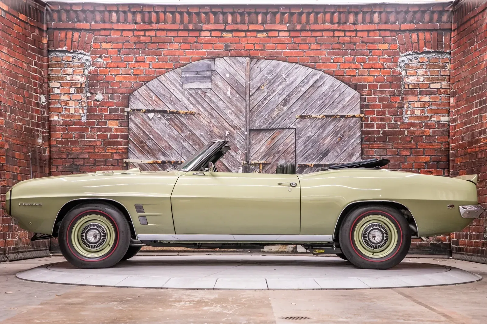 This 1969 Firebird convertible reflects that original vision while incorporating significant updates. Refurbished prior to its current ownership in 2024, the car now features a replacement V8 engine that has been overbored to 400 cubic inches. The exterior retains its factory Limelight Green color, reapplied during the refurbishment, along with a newly installed powered black soft top. Design highlights include Pontiac’s arrowhead badge centered in the squared grille, dual round headlights, integrated front bumper, and a chrome rear bumper topped by a small spoiler.