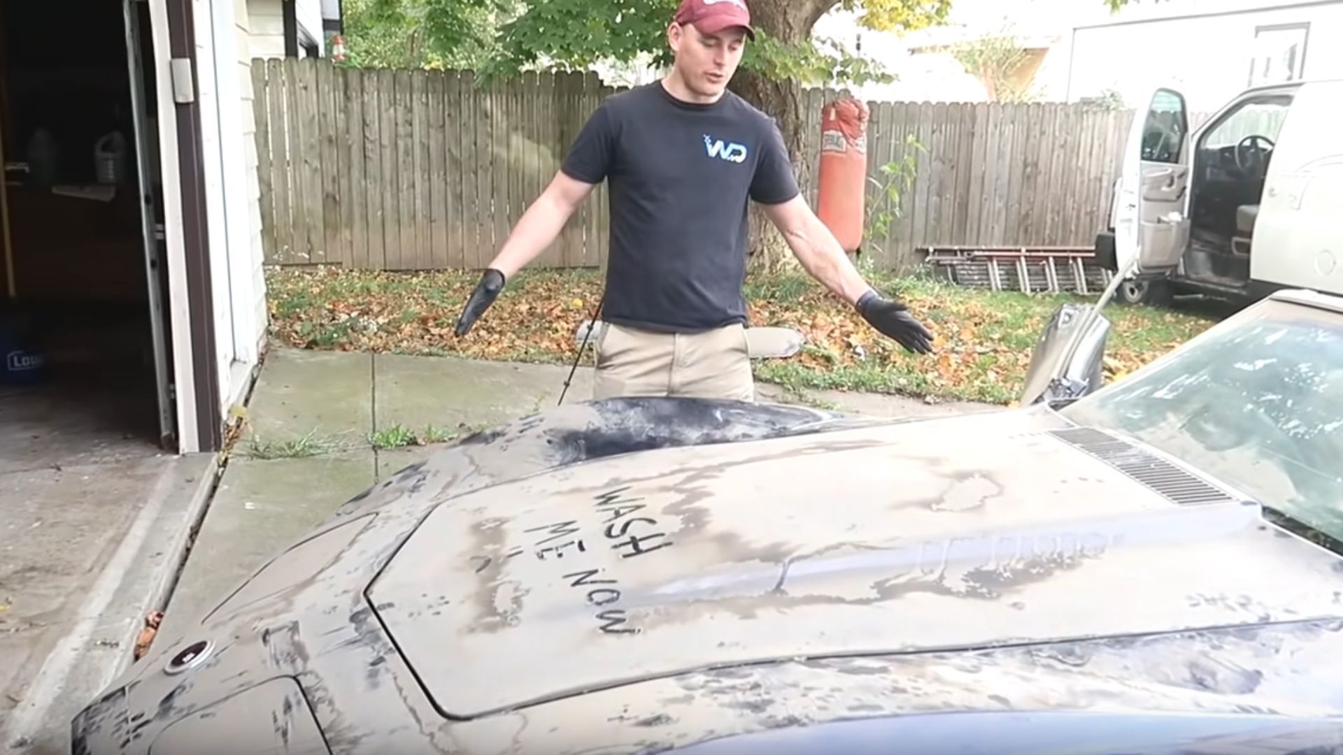 At first glance the car might not look “that dirty” to some. Know the paint is purple, not the black it looks like, a clear indication of how dirty it is. Just watch the entire video and see how much garbage they get off the paint. Also, know the detailers didn’t write “wash me now” in the barn find dust on the hood. These guys are professionals and realize that scratches the paint, but someone else thought they were having some harmless fun.