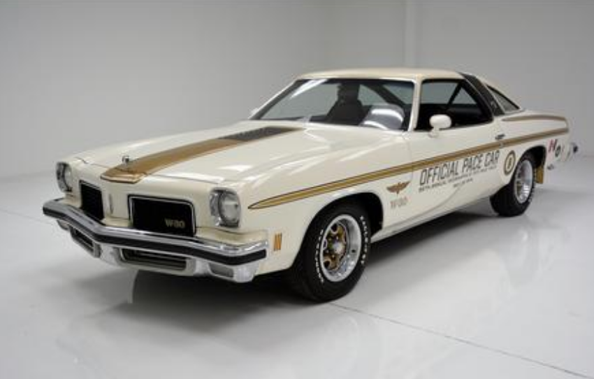 1974 Oldsmobile 442 Indy Pace Car Olds returned to the Brickyard again in 1974, for the third time in five years. And for the second time in three years as a Hurst/Olds. For the first time, a 350 V8 could be ordered, and was mandatory for California-bound cars. The 455 was still available, but emissions and fuel economy concerns were taking their toll. White and black were again the two color choices, and a roof band split the vinyl top in two at the B pillar to simulate the targa top on the actual pace car. Production was up some, with 1851 produced: 1800 coupes (46 were used at the track), 42 Delta 88's, 1 Cutlass 4-door, 2 Official Pace Cars, 6 Custom Cruisers for Press, Track Photographer, Medical Director and Day Care. The Delta 88 convertible track cars were all basically stock cars with white paint and H/O trim, but they are a striking vehicle and quite rare today. In addition, Speedway owner Tony Hulman requested a specially modified Cutlass Salon 4-door sedan for his own personal use, and it was built by Oldsmobile, but appeared at the track with H/O graphics applied. 1974 was indeed an unusual year for H/O watchers.